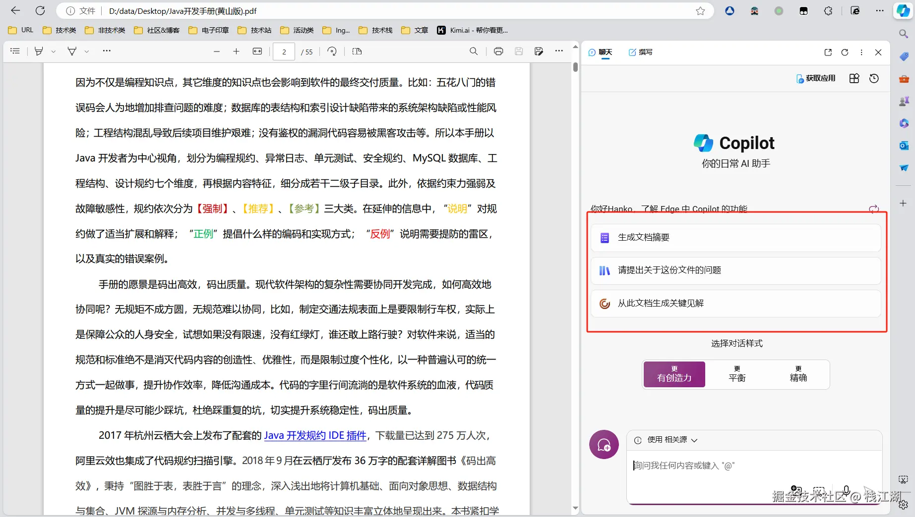 Copilot也就是之前的new bing,可以看到微软的edge浏览器自带了Copilot插件,在浏览器的右上角的copilot logo。打开pdf文件后,点击copilot logo就会显示相应的功能项: