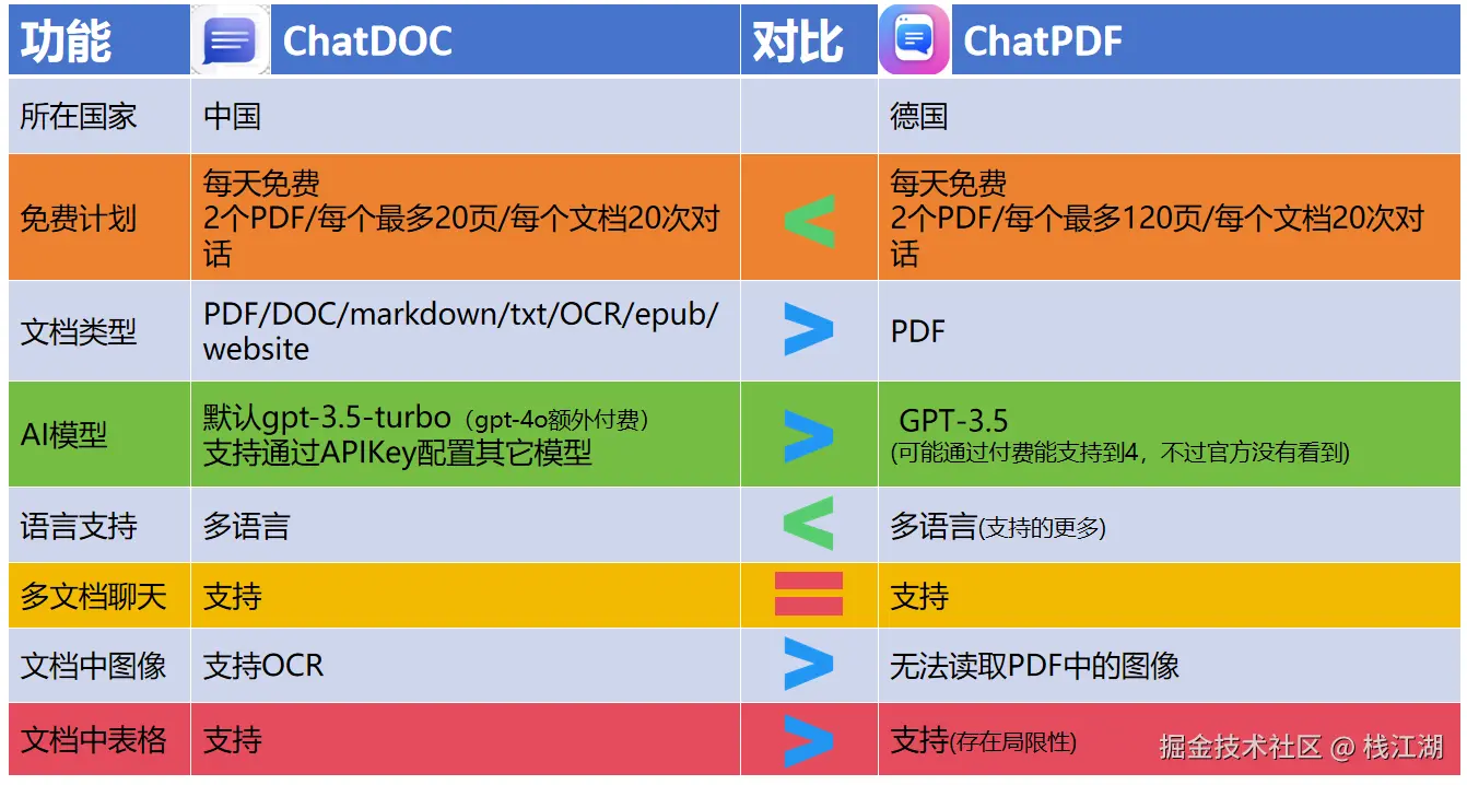 从表格里可以看到ChatDOC与ChatPDF都是基于GPT的产品,但在功能上ChatDOC还是比ChatPDF功能强大的多