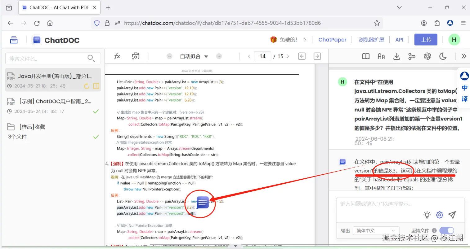 可以看到,这种定位能力并不是单纯的类似查找的功能,ChatDOC理解了我们的问题,并也能理解文件中的内容、代码或公式表达的意思。从而得出相应正确的回答,同时还能给出ChatDOC依据在文件中的出处。
