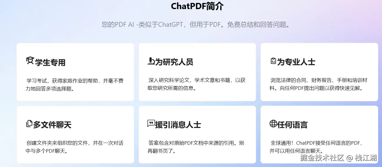 PDF AI 支持总结长文信息、追溯原文、外文翻译提炼等文章处理任务,助你轻松高效阅读 PDF科研论文、报告、产品手册、法律合同、书籍等文件。
