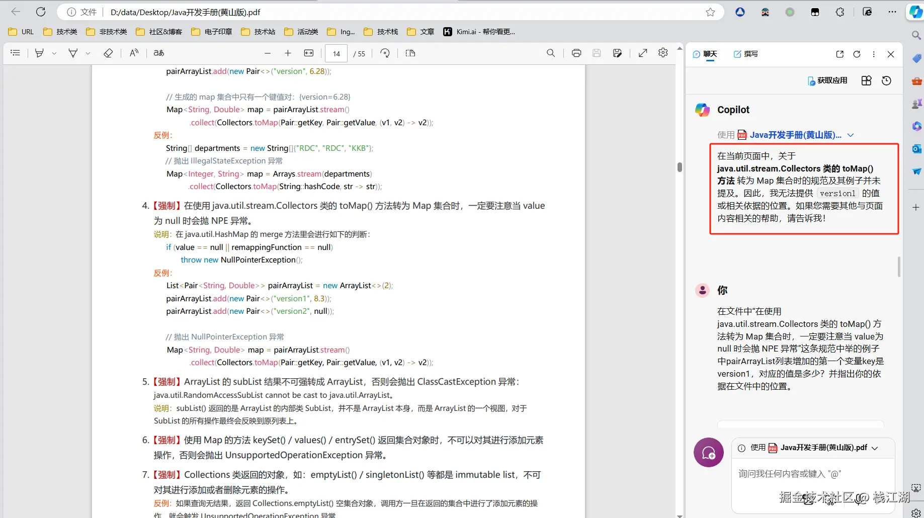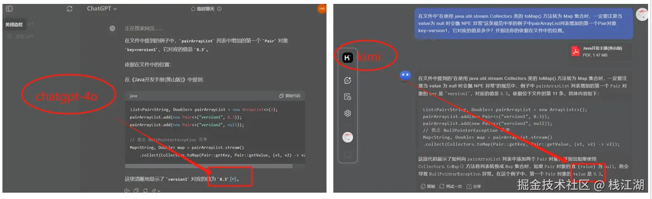 在文件中“在使用 java.util.stream.Collectors 类的 toMap() 方法转为 Map 集合时,一定要注意当 value为 null 时会抛 NPE 异常”这条规范中举的例子中pairArrayList列表增加的第一个变量version1的值是多少?并指出你的依据在文件中的位置。