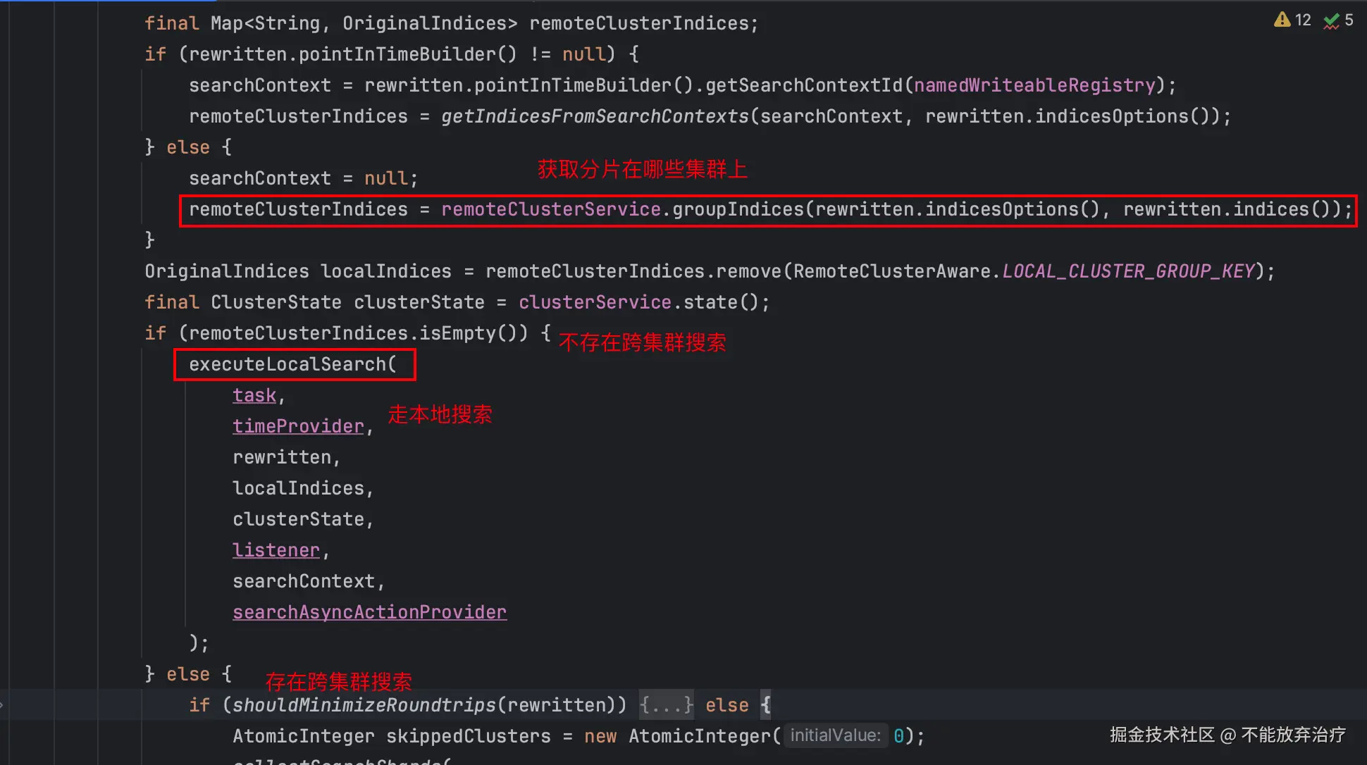 - 如果不存在跨集群搜索,则走本地集群搜索,否则走跨集群搜索。一般来说,日常开发都是本地集群搜索,所以这里着重讲解本地搜索。