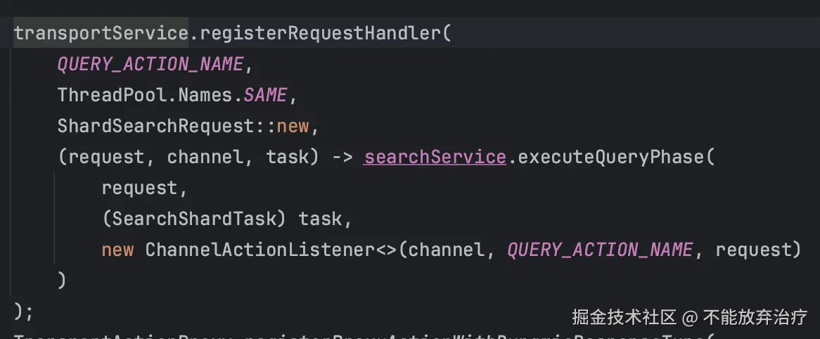 TransportSearchAction 在初始化时,就会调用 SearchTransportService#registerRequestHandler(...) 注册 RPC 请求处理函数。