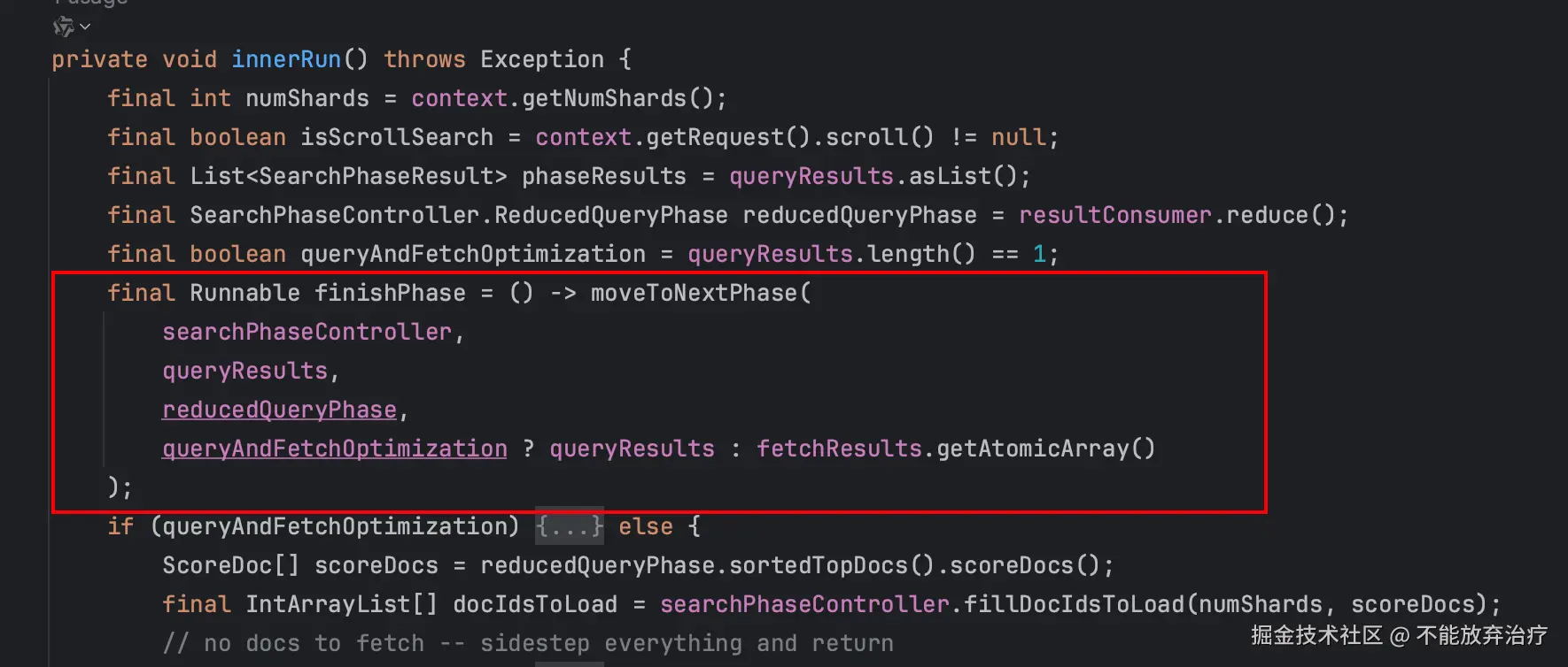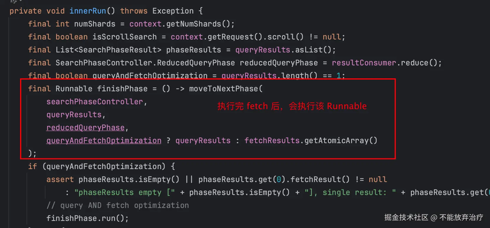 需要注意的是,FetchSearchPhase#innerRun() 创建了一个 finishPhase Runnable,在执行完 fetch 后,结果会回调至该方法。