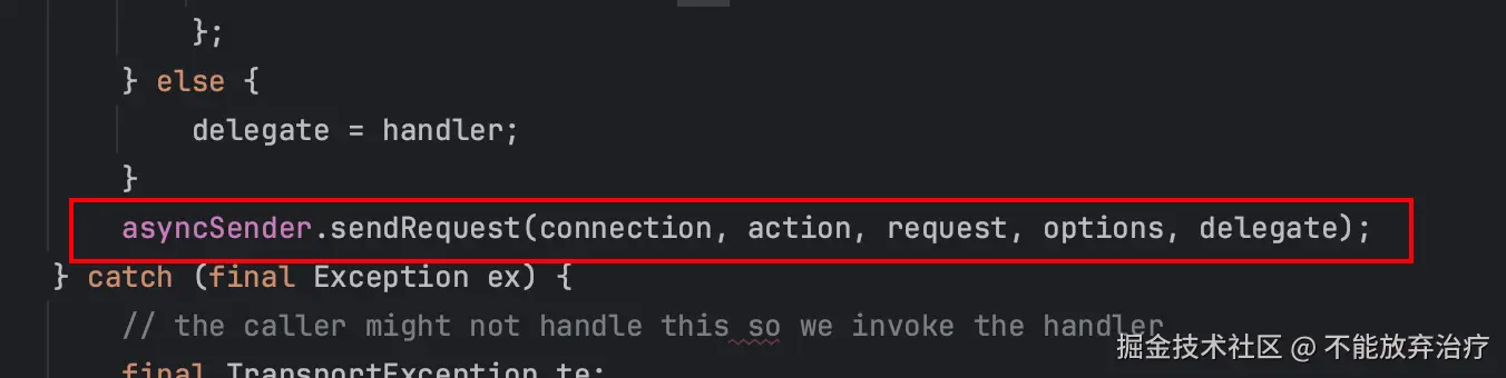 最后代码会走到 TransportService#sendRequest(final Transport.Connection connection,final String action,final TransportRequest request,final TransportRequestOptions options,final TransportResponseHandler<T> handler)