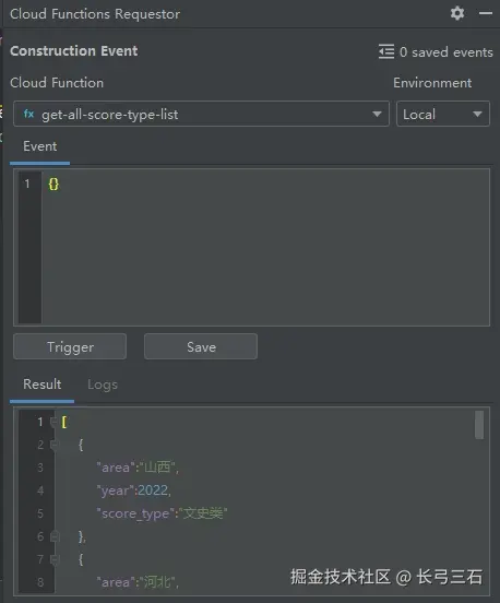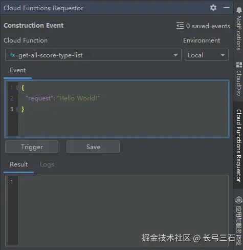 选择要请求的函数,选择本地还是云端环境,然后输入触发事件需要的参数,再单击“Trigger”按钮即可获取调用结果,如图所示: