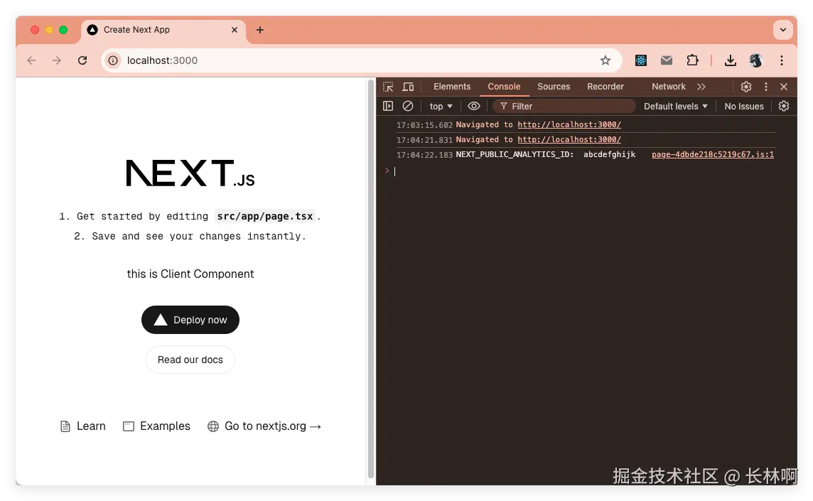 实操一下;在 .env 文件中添加 NEXT_PUBLIC_ANALYTICS_ID=abcdefghijk 然后在客户端组件中使用,客户端代码如下: