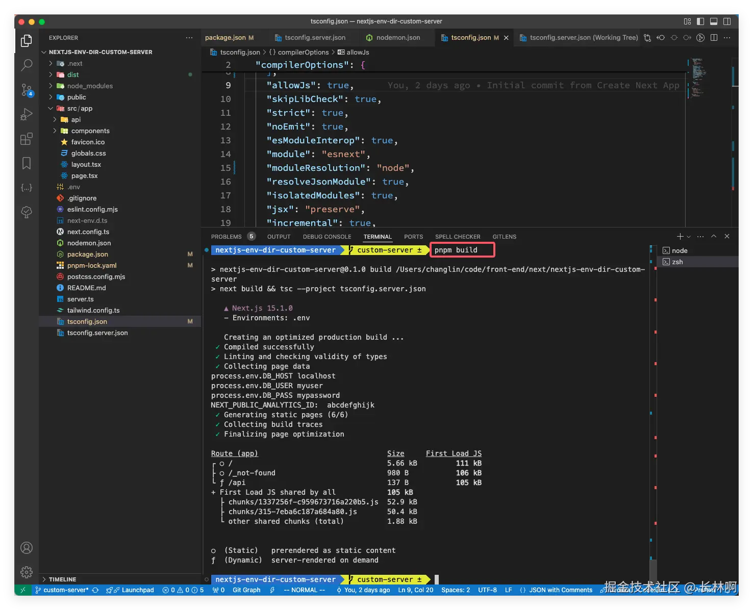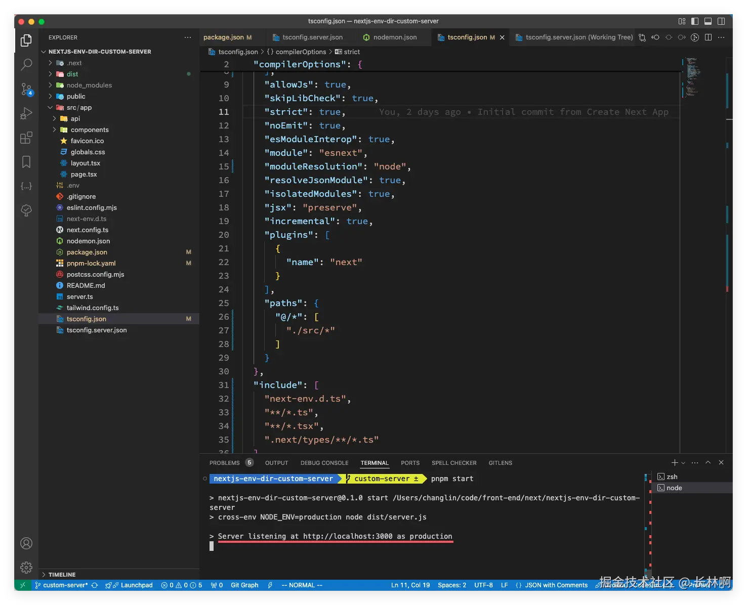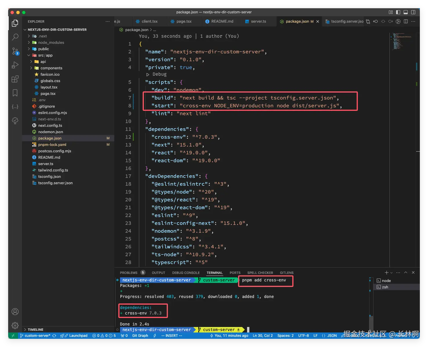 在开发阶段已经把 tsconfig 配置好了,构建阶段也是一样的,所以我们接下来调整一下 package.json 中原来的构建命令和启动生产服务的 start 命令,在启动生产服务的时候需要设置环境变量,为了兼容各个系统的兼容性,这里使用 cross-env 库来处理;既然实在生产阶段用,那就先安装 cross-env: