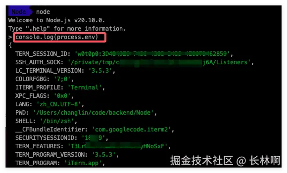 Node.js 的核心 process 模块提供了属性 env,它提供进程启动时设置的所有环境变量。所以获取也很简单,如下图(红色框中的代码):