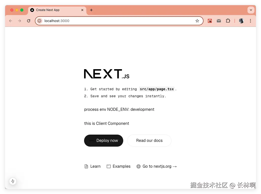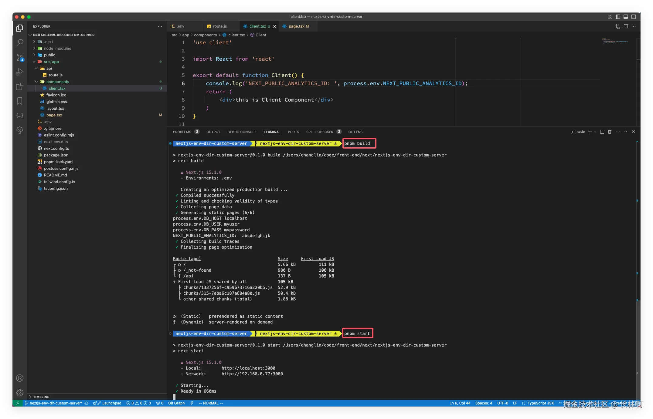 在 /app/page.tsx 中引入 <Client /> 组件,接着就运行 pnpm build 构建项目,构建完成之后使用命令 pnpm start 启动构建后的产物,如下: