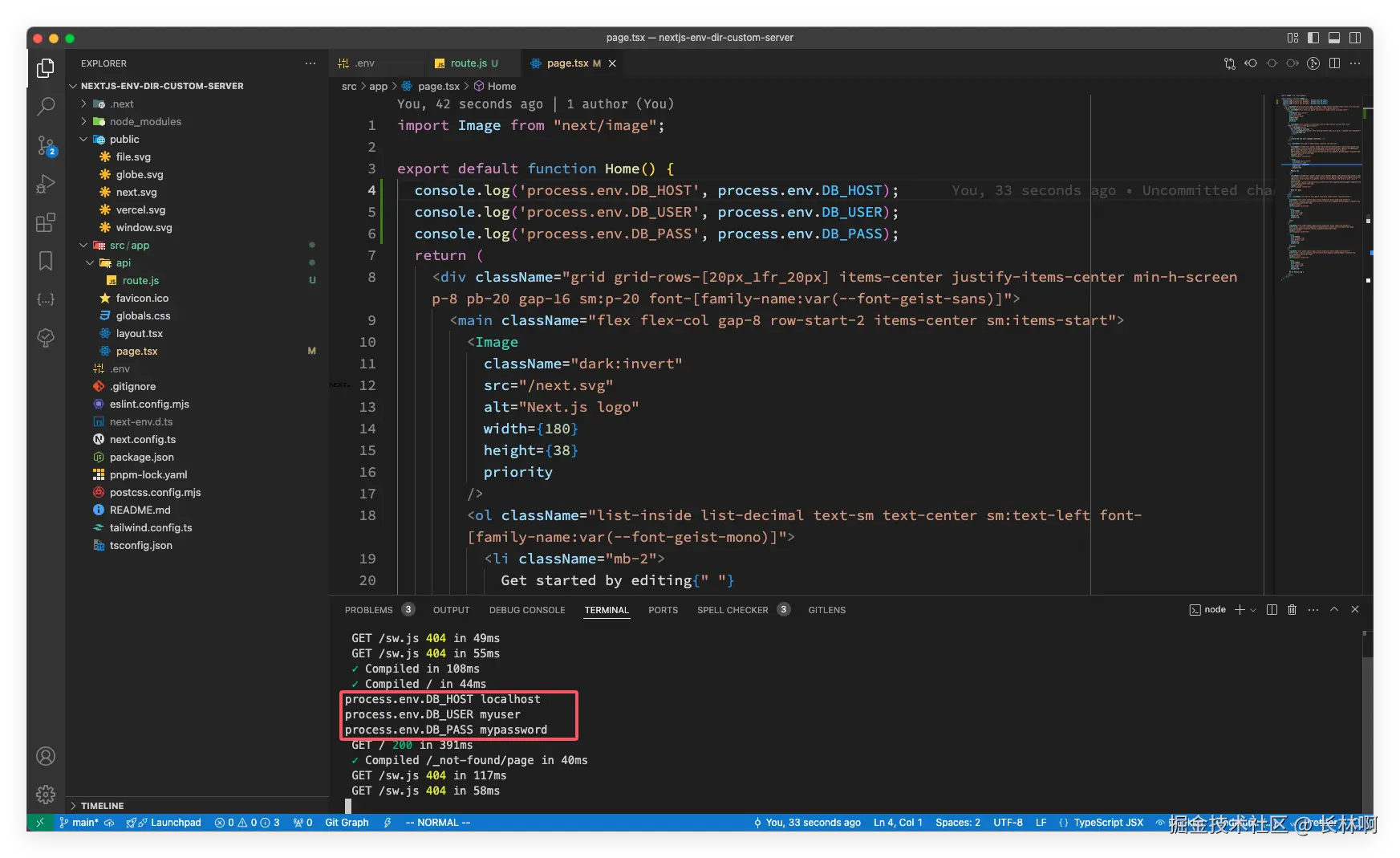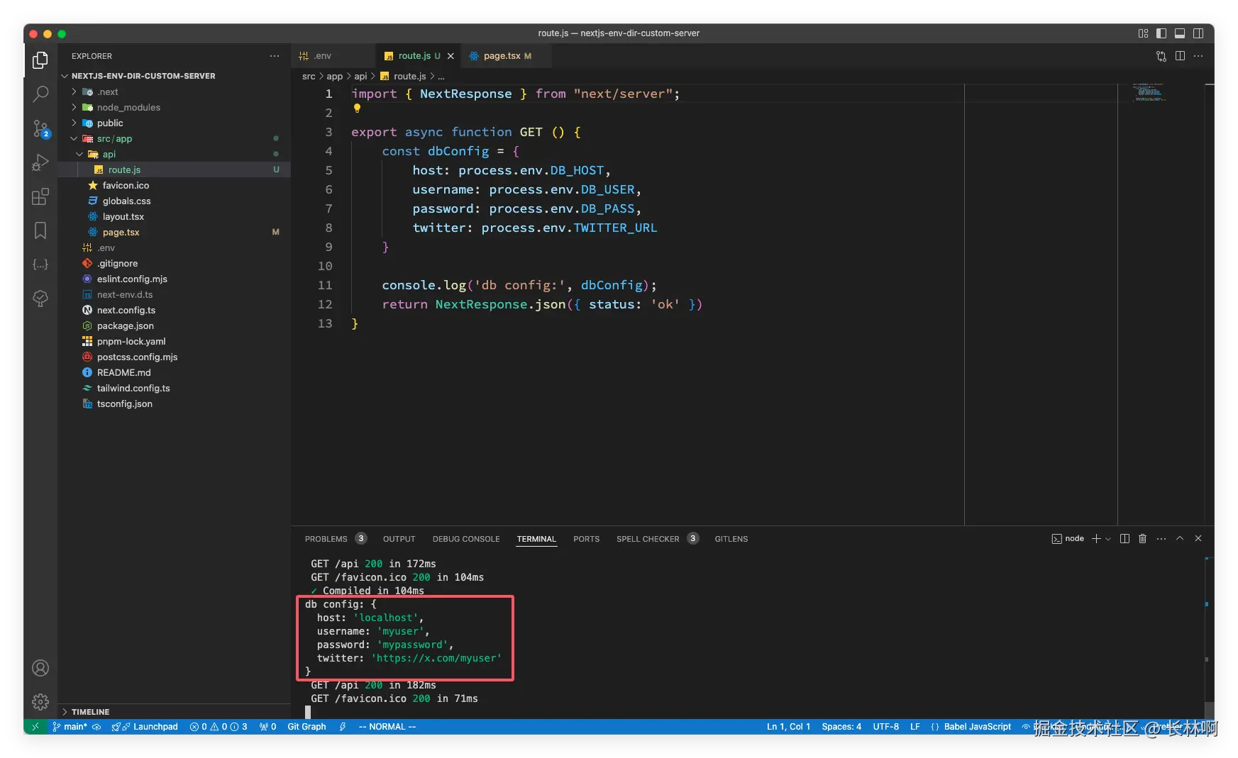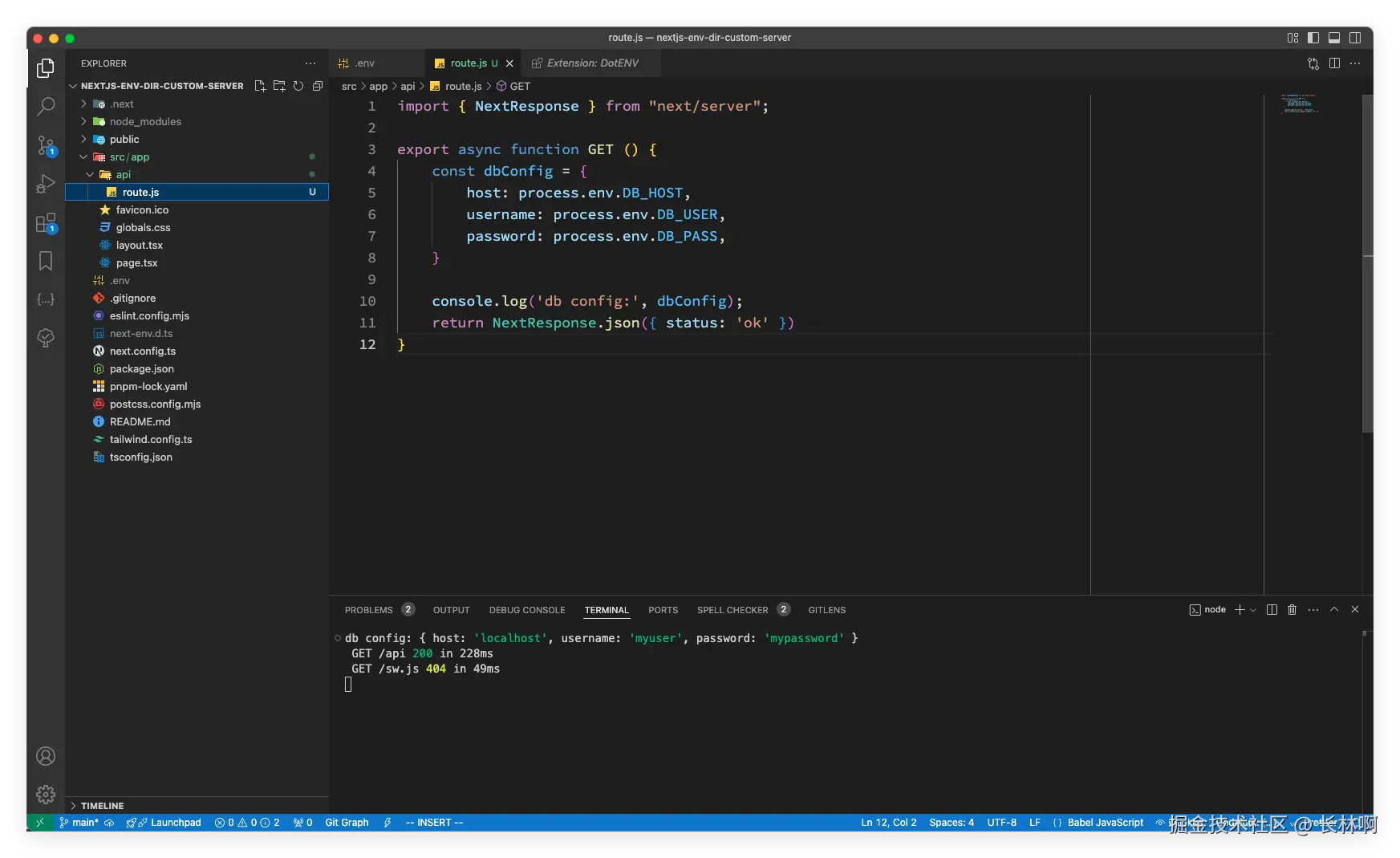 // src/app/api/route.js export async function GET () { const dbConfig = { host: process.env.DB_HOST, username: process.env.DB_USER, password: process.env.DB_PASS, } console.log('db config:', dbConfig); }在浏览器中请求