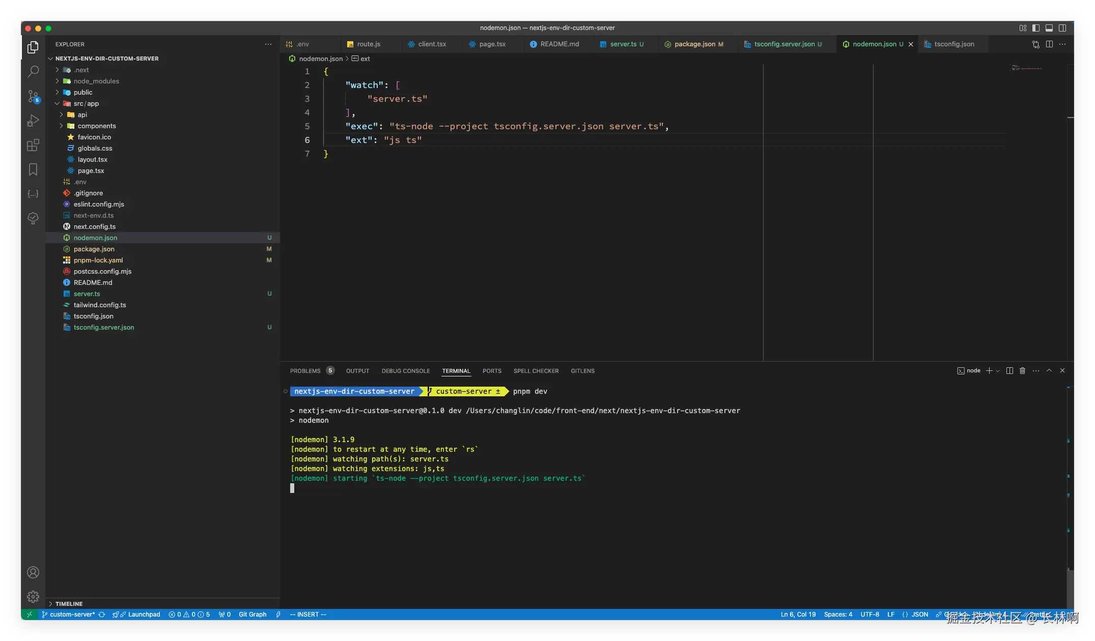 安装完 nodemon 之后,就在项目的根目录创建一个 nodemon.json 文件,这个配置文件告诉 nodemon 监视 server.ts 文件,当它发生变化时,使用 ts-node 来执行这个文件,并使用 tsconfig.server.json 作为 TypeScript 配置文件。写入如下内容: