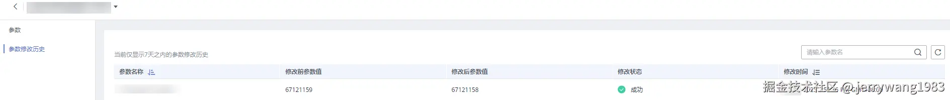 单击具体“名称/ID > 参数修改历史”,展示自定义参数模板中参数修改记录。