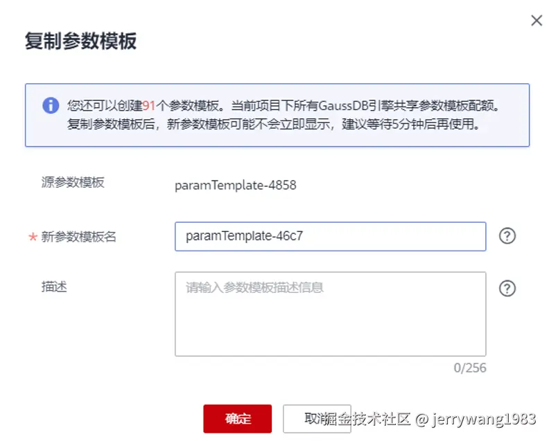参数名称 参数解释 源参数模板 显示待复制的参数模板名称。 新参数模板名 在1到64个字符之间,区分大小写,可包含字母、数字、中划线、下划线或句点,不能包含其他特殊字符。 描述 非必填。描述不能超过256个字符,且不能包含特殊字符!<"='>&和回车。 -
