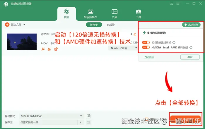 第三步:点击【高速转换】启动【120倍速无损转换】和【AMD硬件加速转换】技术,然后点击底部的【全部转换】按钮即可。