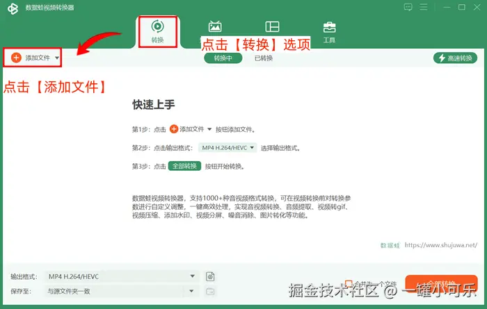 第一步:打开数据 蛙视频转换器,点击页面上方的【转换】选项,在格式转换界面上,点击【添加文件】上传需要转换成mp4格式的视频。