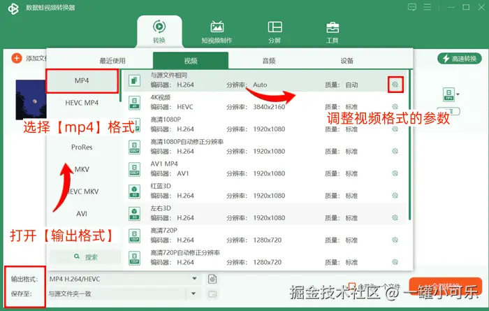 第二步:打开【输出格式】,在格式选择列表中,选择【mp4】格式,点击设置标志,调整视频格式的参数。