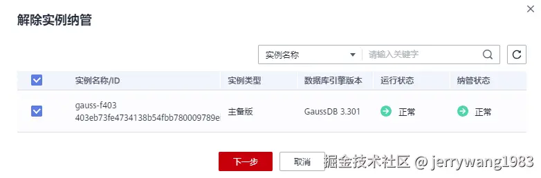 选择需要解除纳管的实例,单击“下一步”。