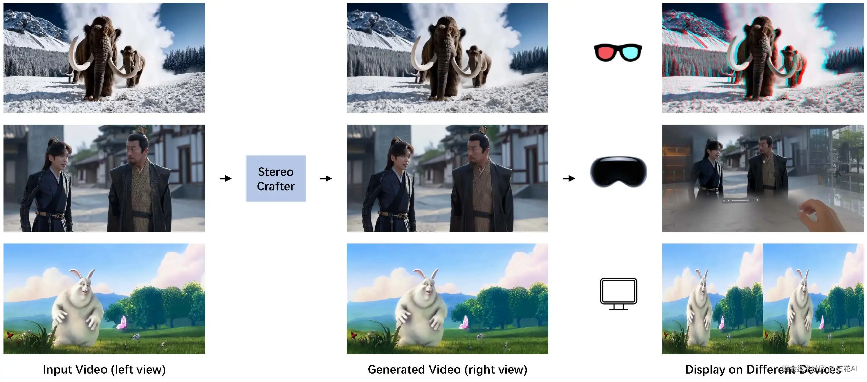StereoCrafter[3] 是腾讯开源的一个强大模型,能够将任何普通视频转换为红蓝、VR 或左右格式的 3D 视频。