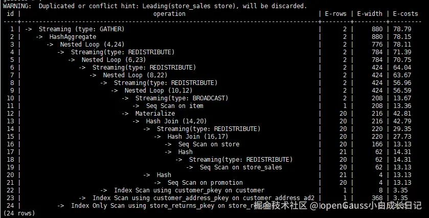 该hint表示:表之间的join关系是:store_sales和store先join,store_sales做内表,然后依次跟promotion、item、customer、ad2、store_returns做join。生成计划如下所示: