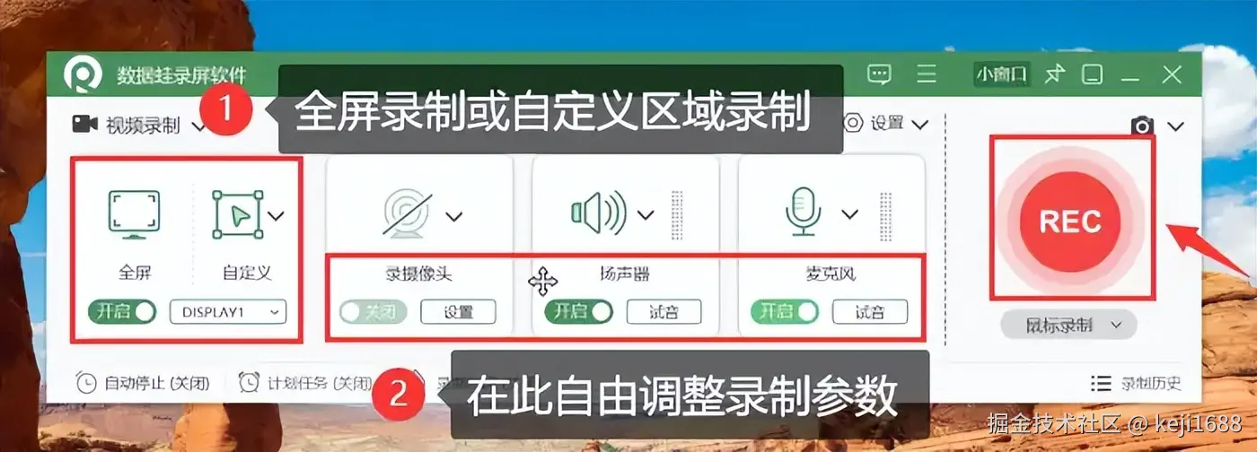 步骤1:在电脑上启动录屏软件,并在首页中选择合适的录屏模式。并可自由选择录制区域,如全屏录制或自定义区域录制,调整录制参数后即可点击【REC】按钮进行录屏。