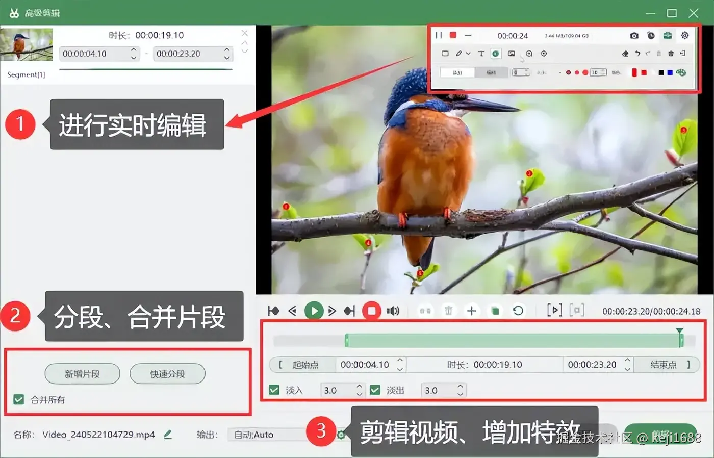 步骤2:录制进行时可使用工具箱对视频进行实时的编辑。录制完成后,你还可以在软件内对视频进行后期剪辑处理和导出不同格式的视频。