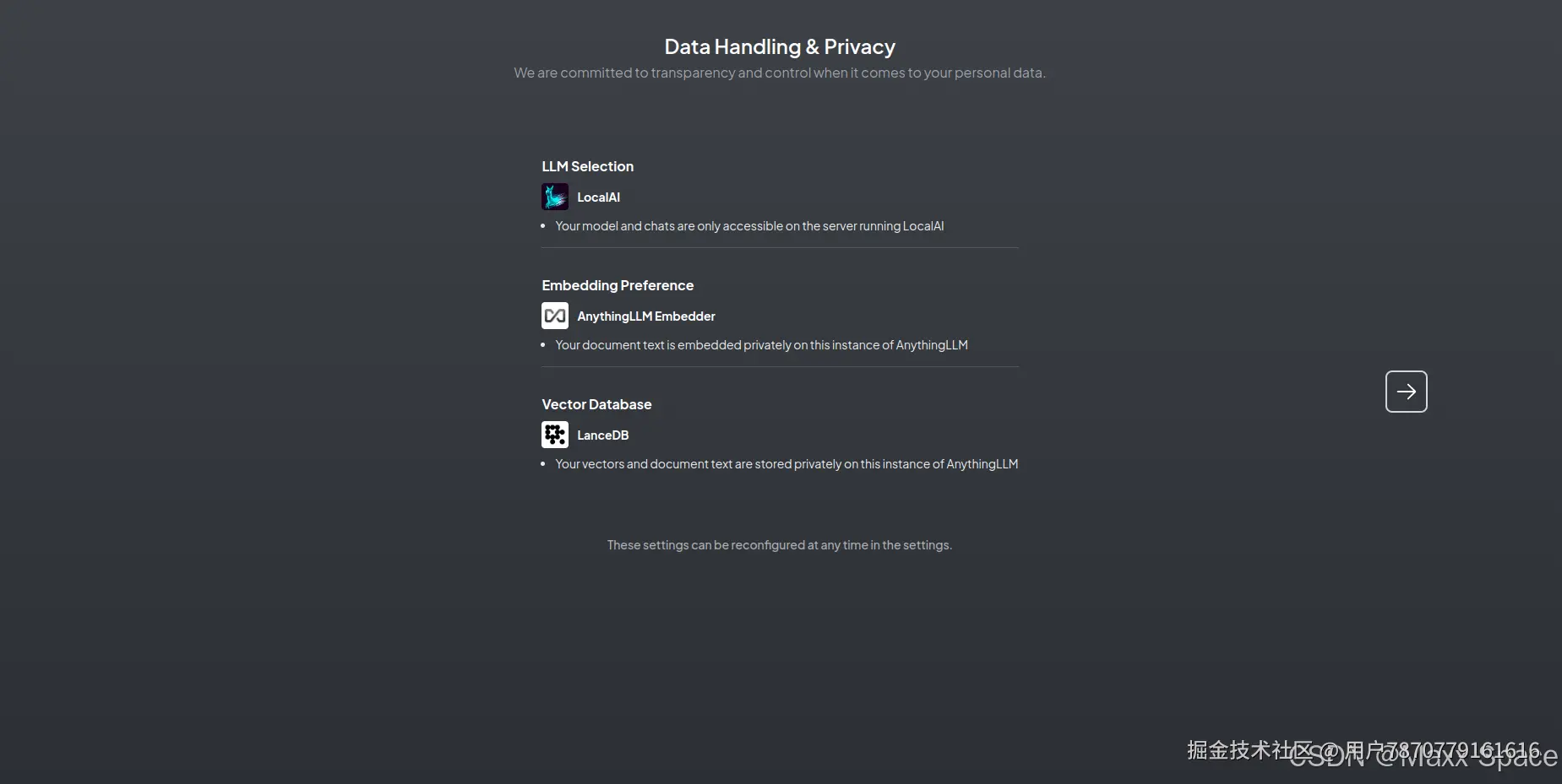 LLM Selection 是你的模型和聊天只能在运行 LocalAI 的服务器上访问,当然你也可以使用 OpenAI,使用更强大的云端模型,提供基础模型支持,但这样的话,就不是完全本地化的私有部署了。Embedding 配置 是你的文档文本已私密嵌入到 AnythingLLM 的此实例中。矢量数据库 是你的向量和文档文本将私密存储在 AnythingLLM 的此实例上。