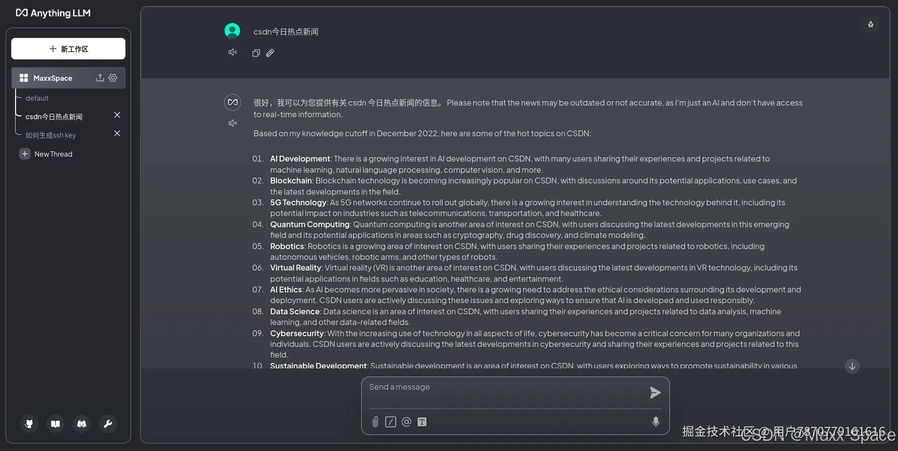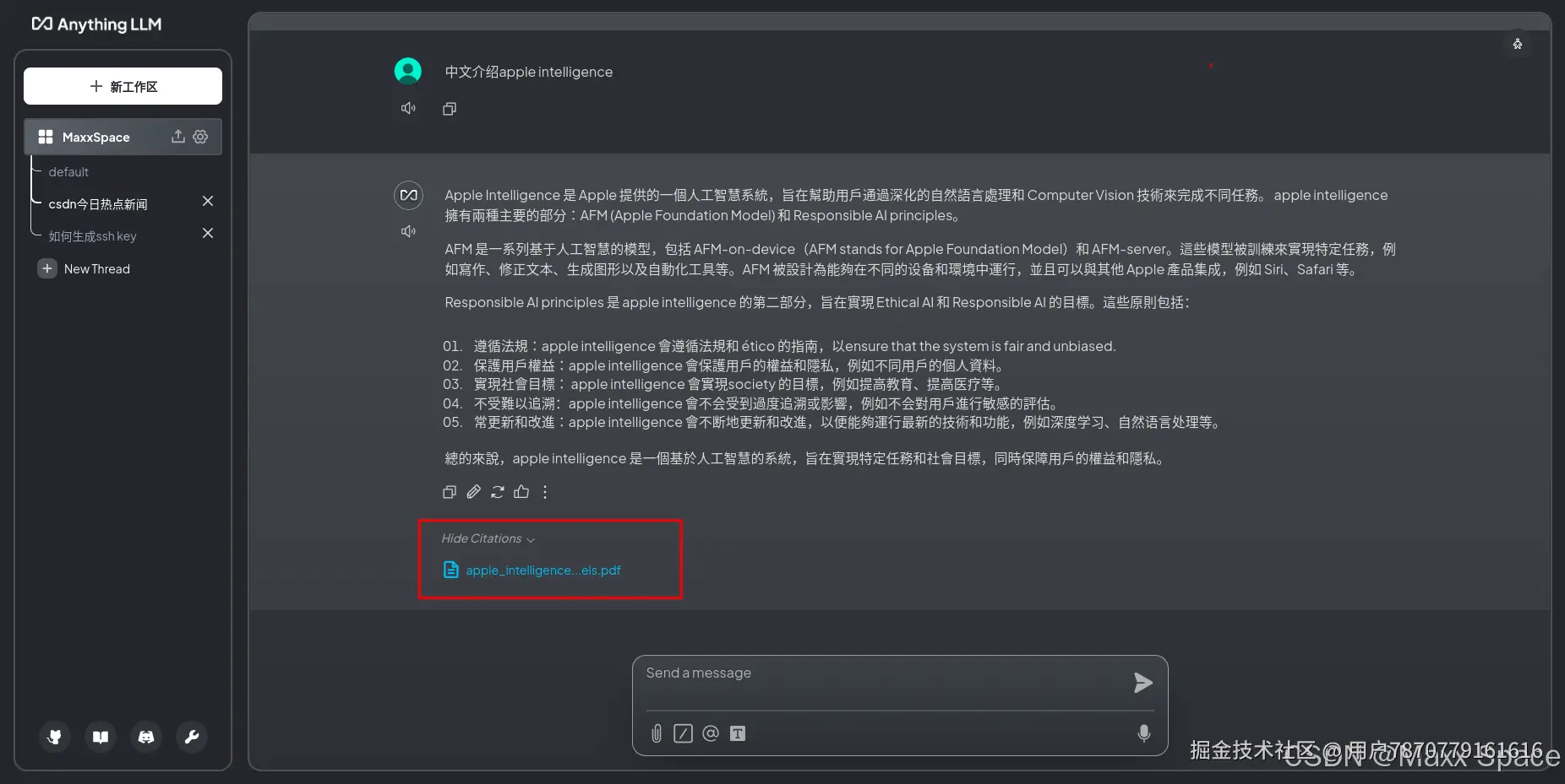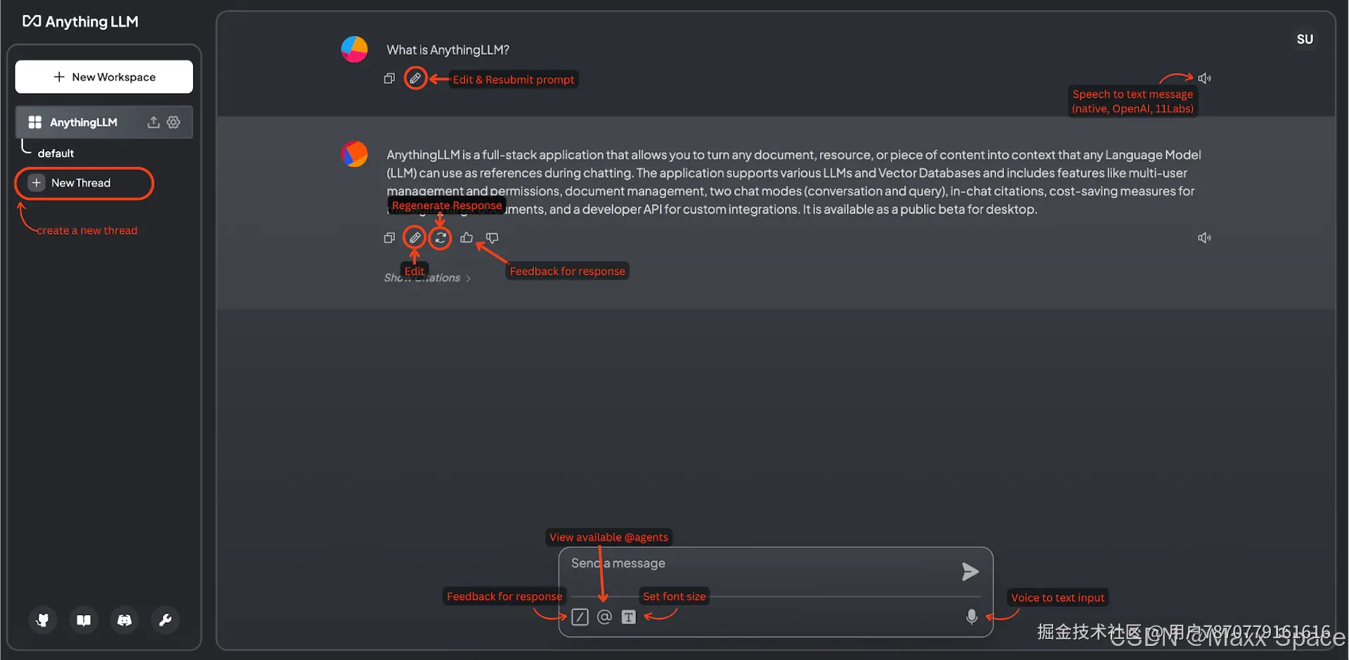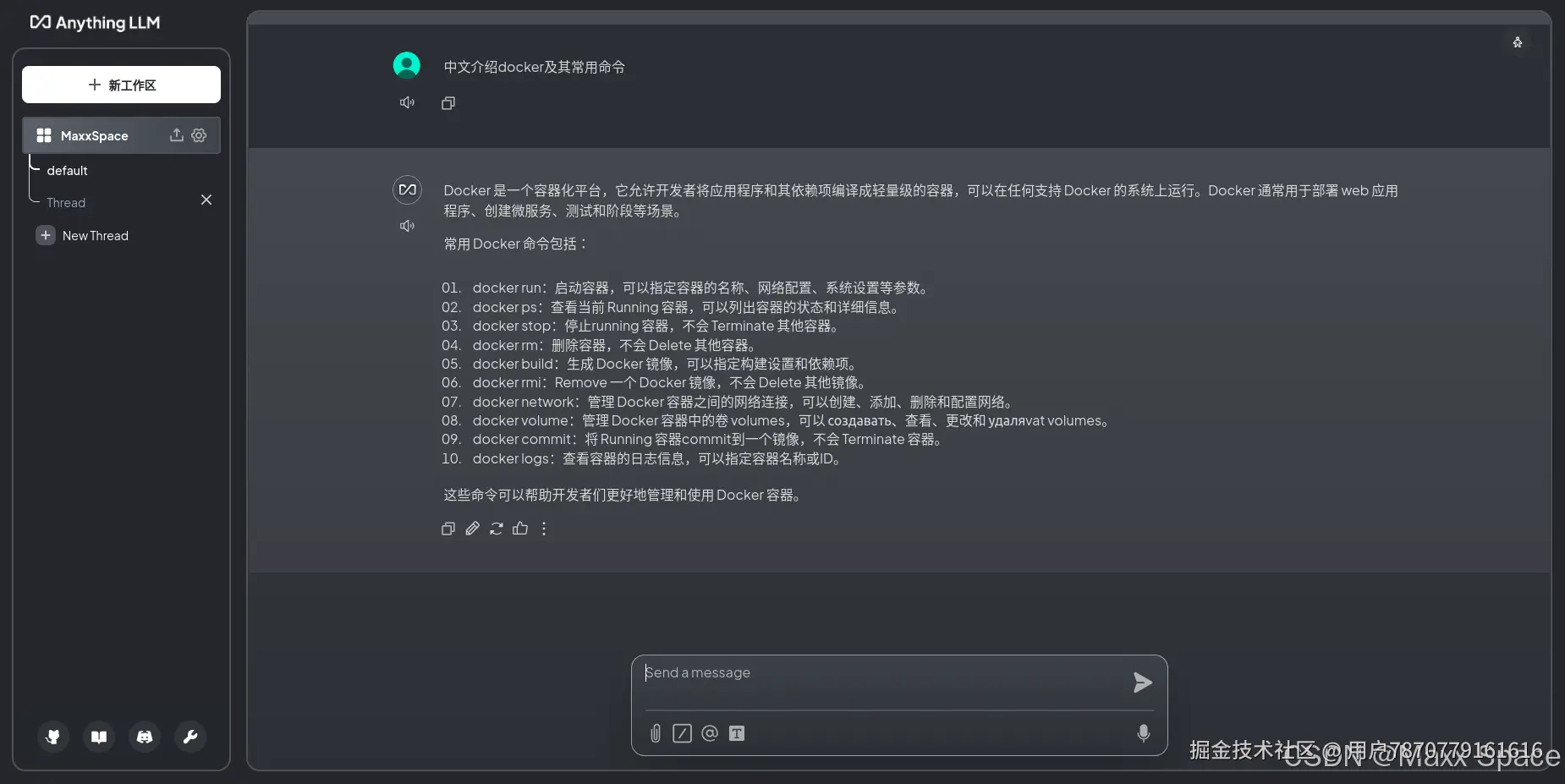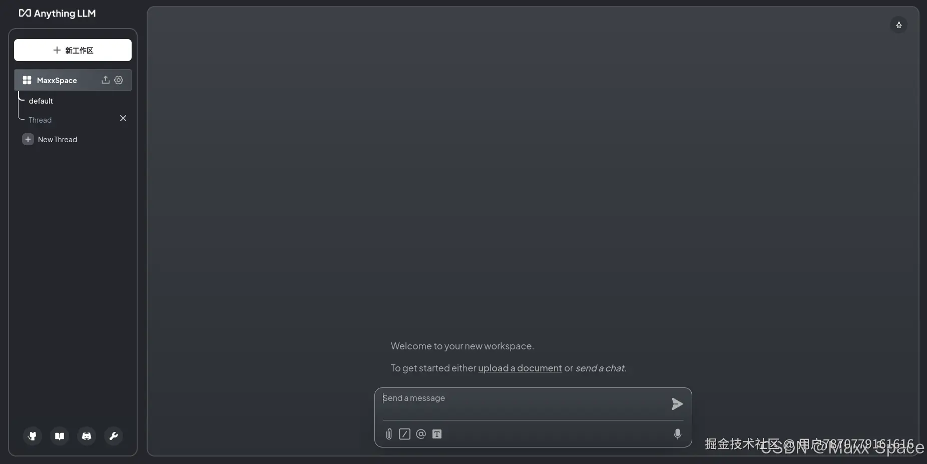 点击工作区,开启一个Chat Thread,我们可以上传文档或者直接对话