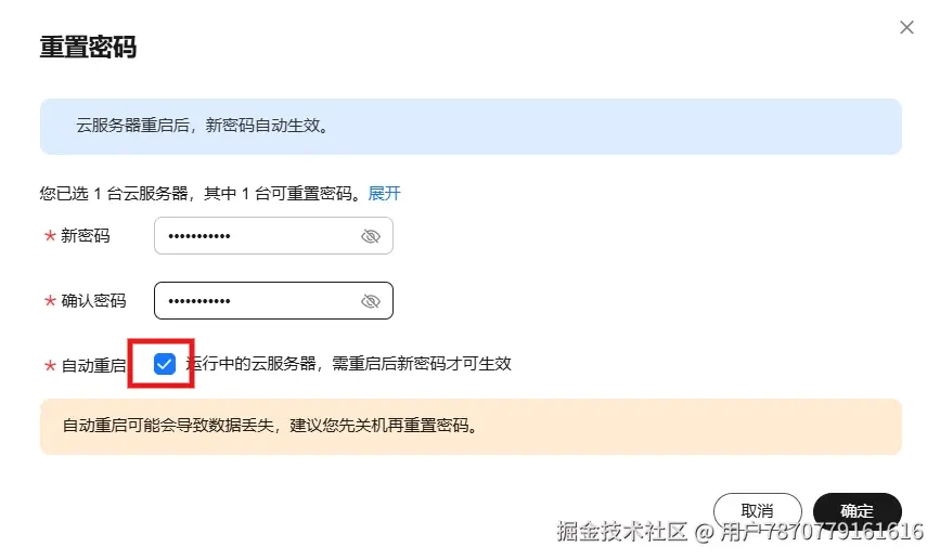 购买服务器的时候可以提前设置用户名和密码,因为我这里跳过了,所以购买完成后需要重置密码,会短信或站内消息通过你的云服务器信息,重点是公网IP地址和用户名,首先打开你的服务器控制台,选择重置密码