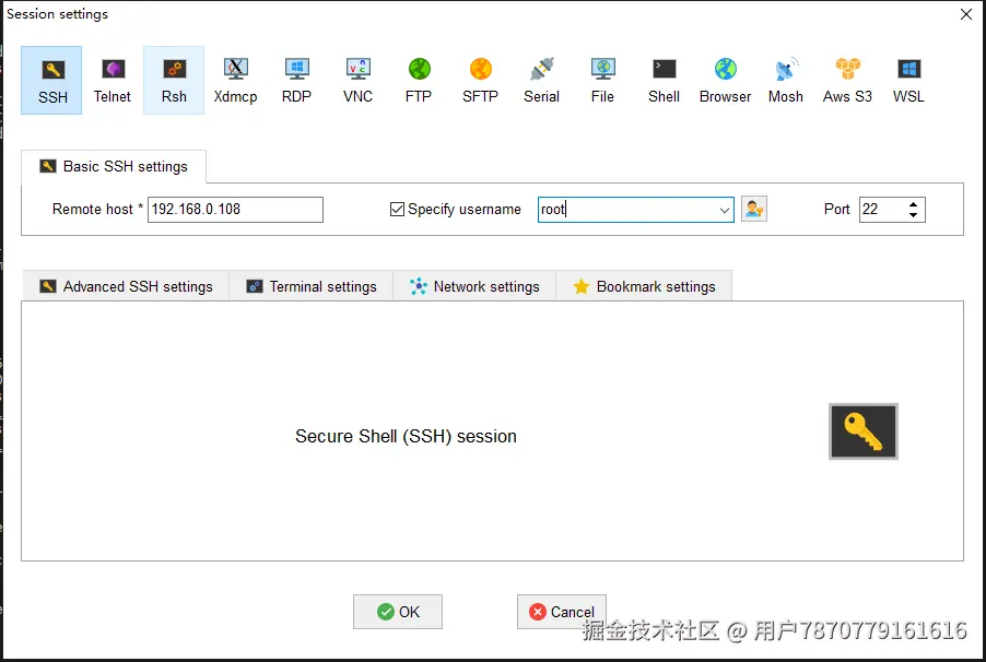 我个人习惯使用 MobaXterm 这款软件,添加SSH连接,输出公网IP、用户名和端口(默认22),连接即可。