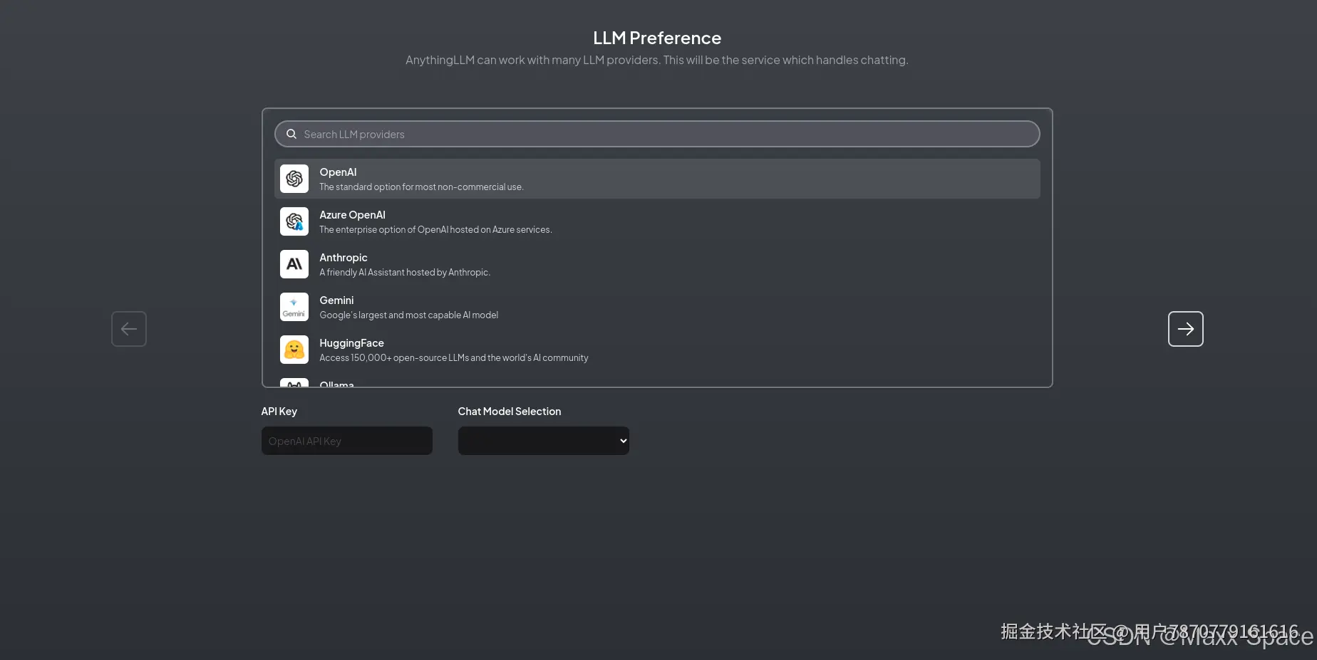 首次进入会进行一些初始化的设置,点击Get Started 进入选择具体的LLM,AnythingLLM 可以与许多 LLM 提供商合作,这将是处理聊天的服务