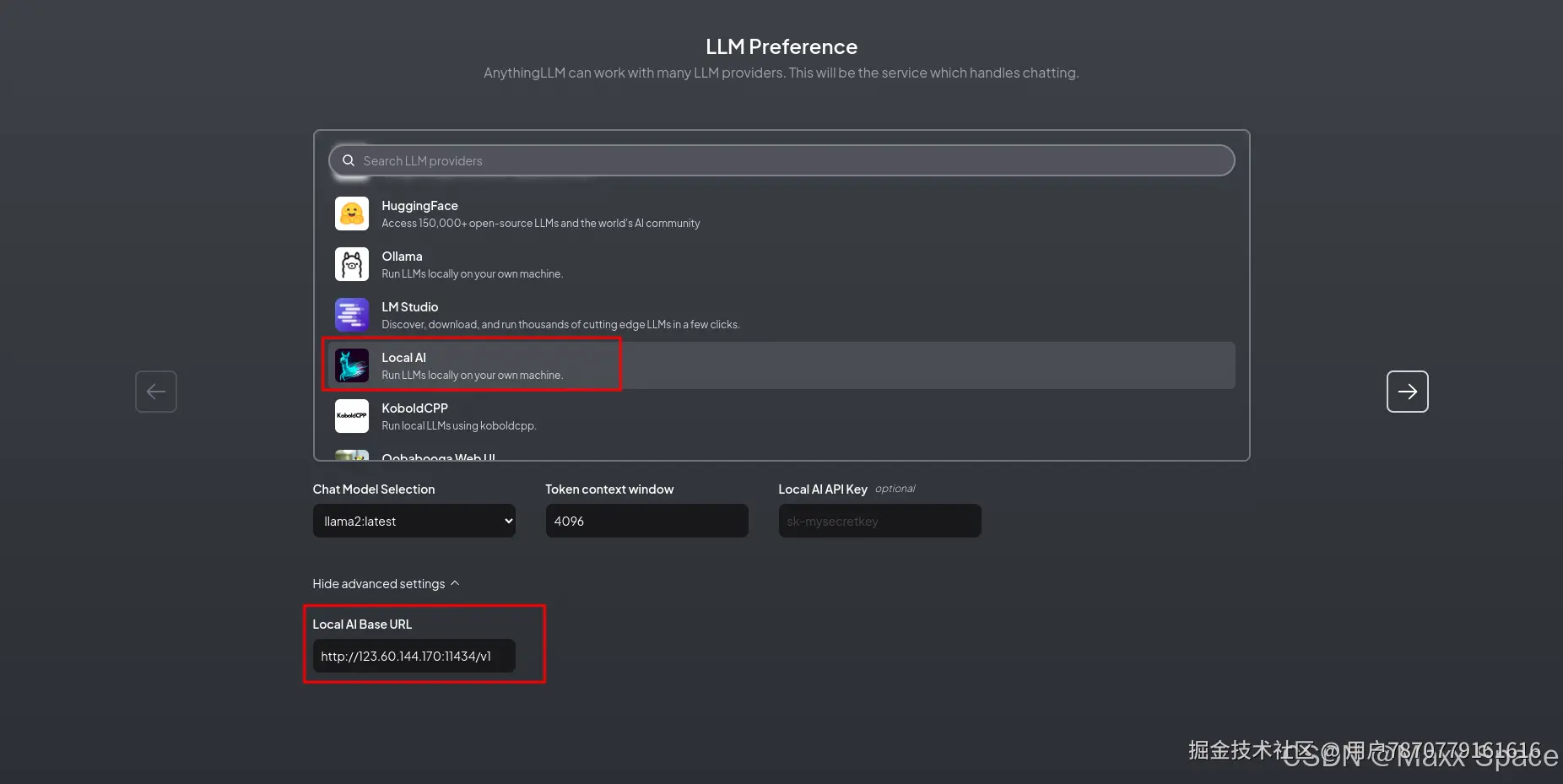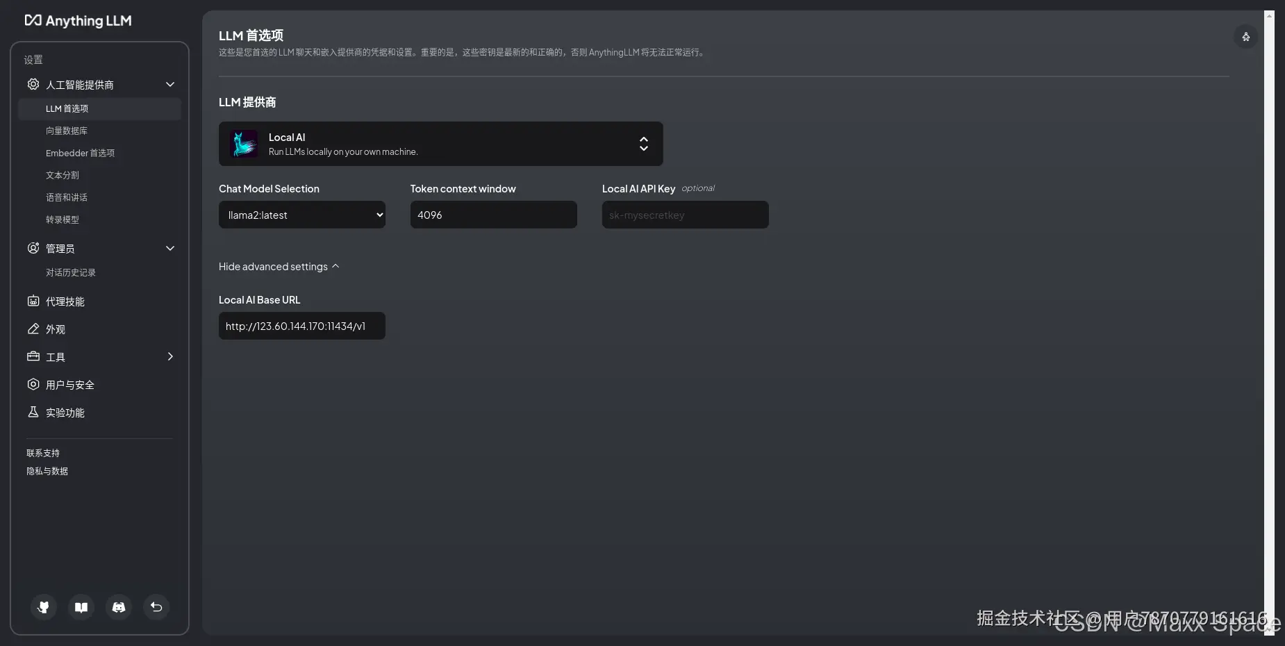 我这里选择Local AI,在 Local AI Base Url 填写之前部署的Ollama服务地址:http://123.60.144.170:11434/v1,然后会识别到模型为 llama2,填写 Token context window 大小,Key 可以不用填写,点击下一步