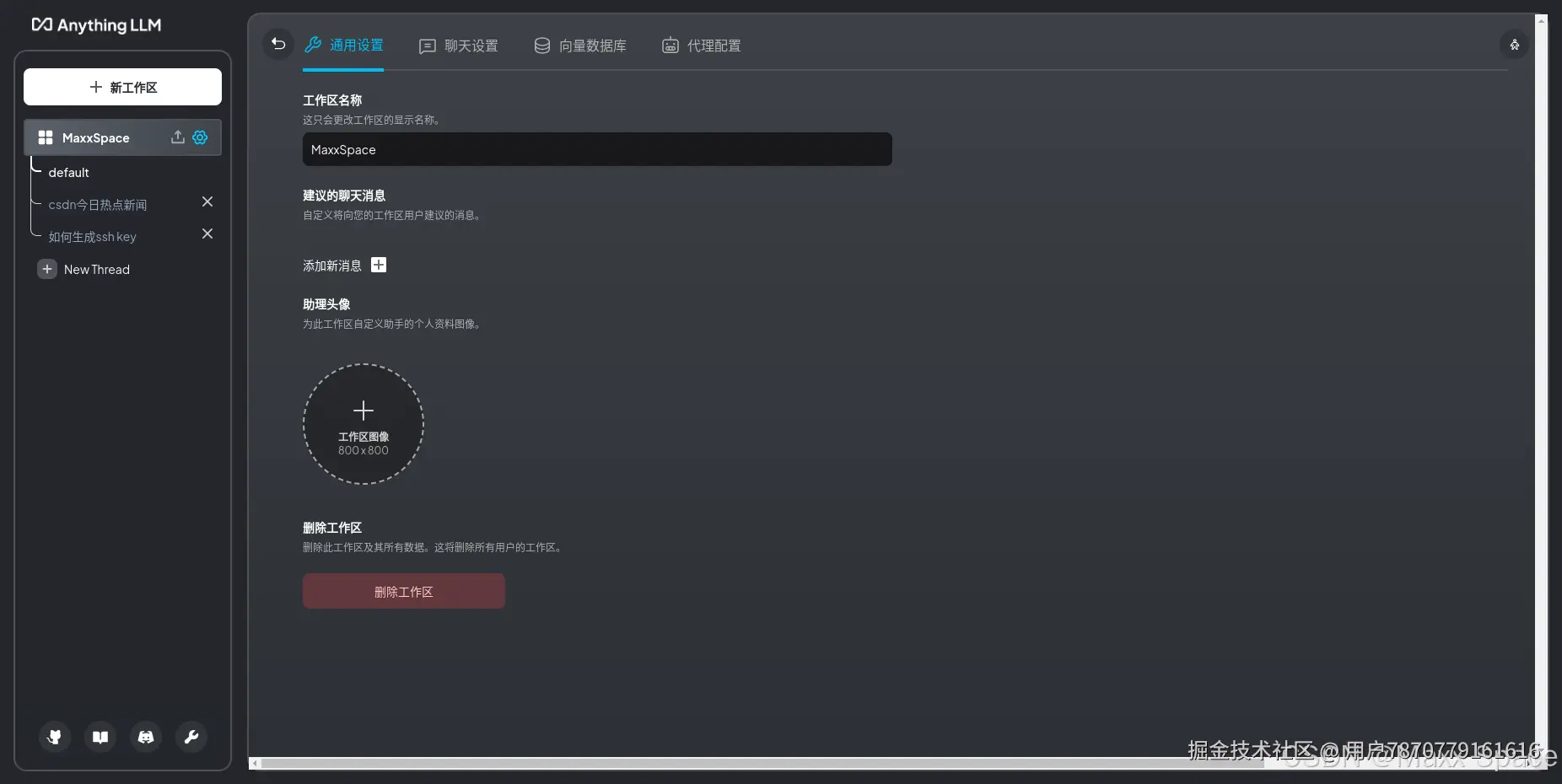 工作区设置,可以修改工作区名称和头像,删除工作区,自定义建议的聊天消息