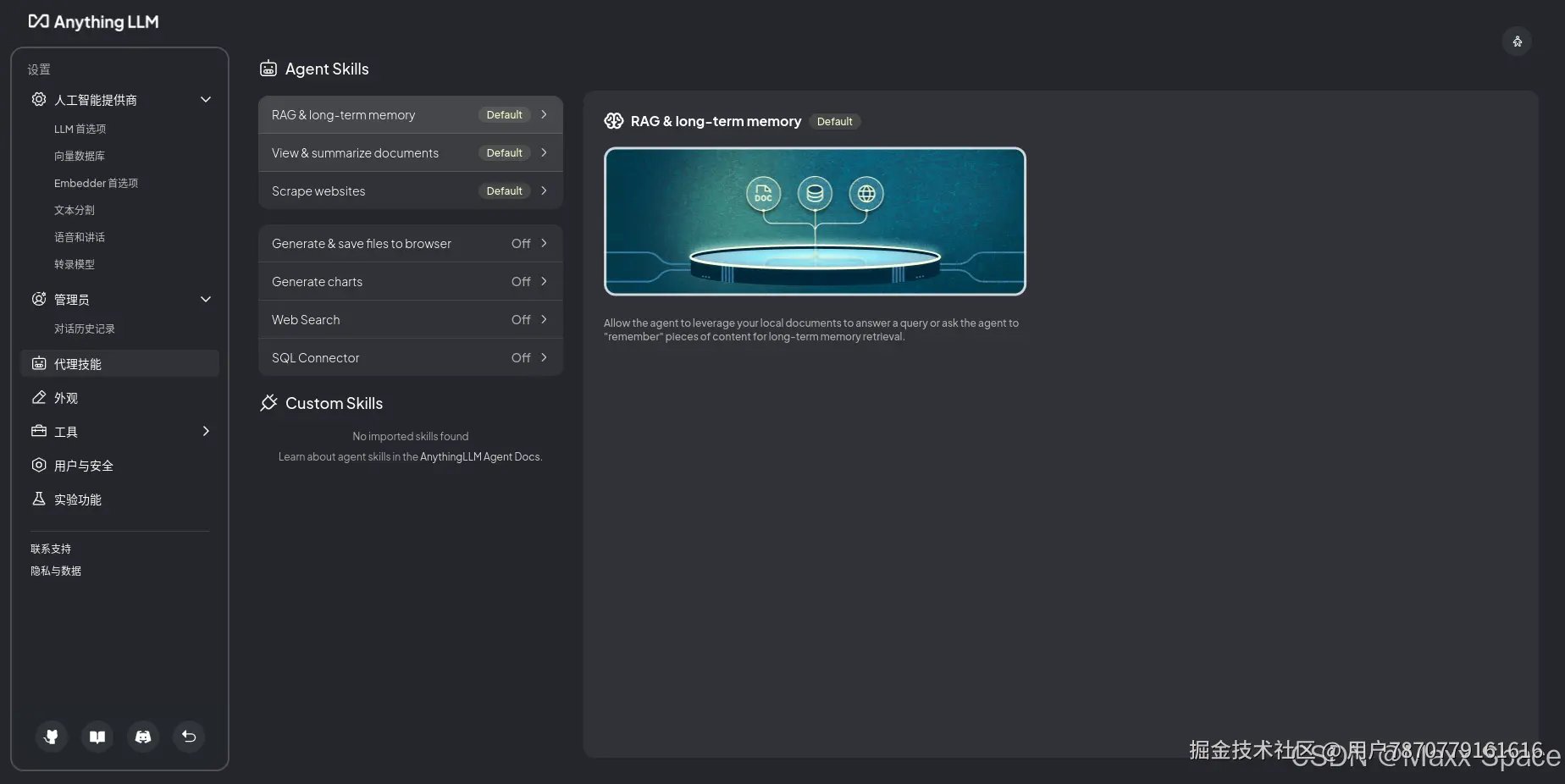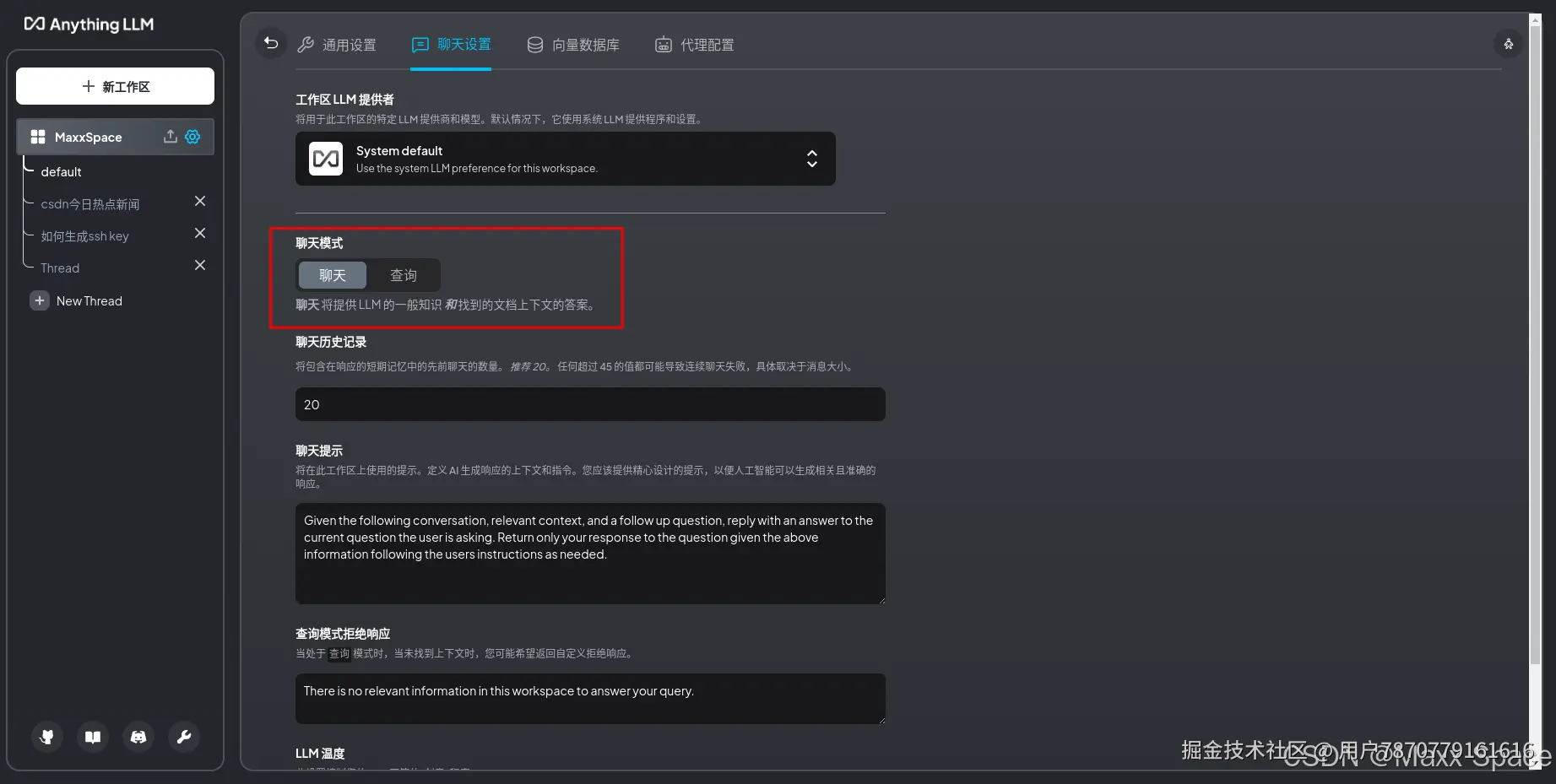 工作区的聊天设置,LLM 提供者选择、聊天模式切换(聊天将提供 LLM 的一般知识 和 找到的文档上下文的答案,查询将仅提供找到的文档上下文的答案)、聊天历史记录等,还有向量数据库最大上下文片段、文档相似性阈值设置、代理设置