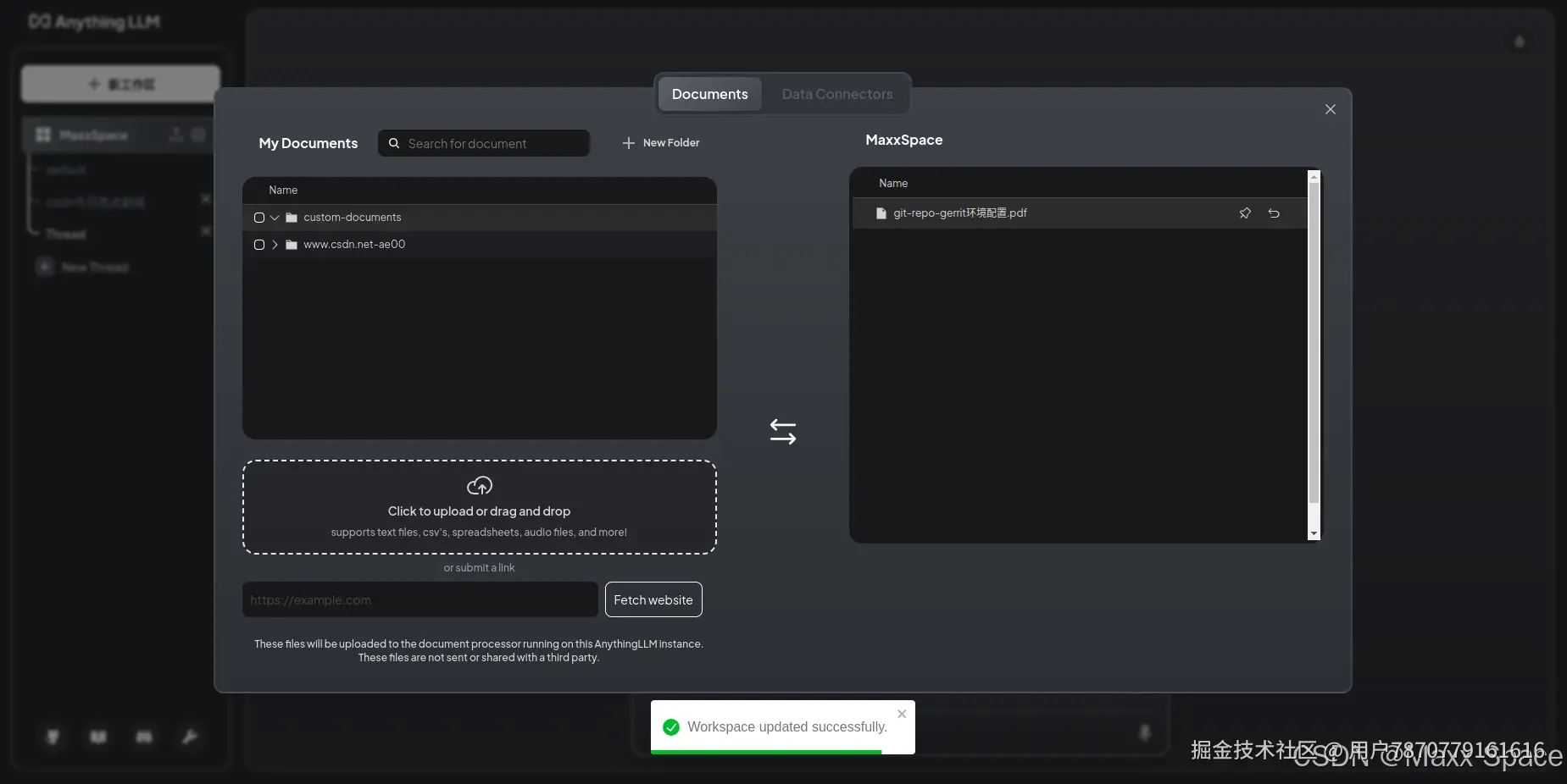 也可以上传文档,需要将文档加入到工作区才可以在对话中引用到
