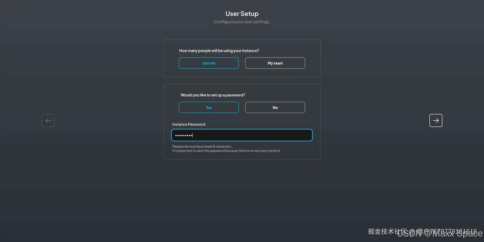 用户设置,需要确定是否多人使用、是否需要设置密码,我这里仅自己使用并设置访问密码