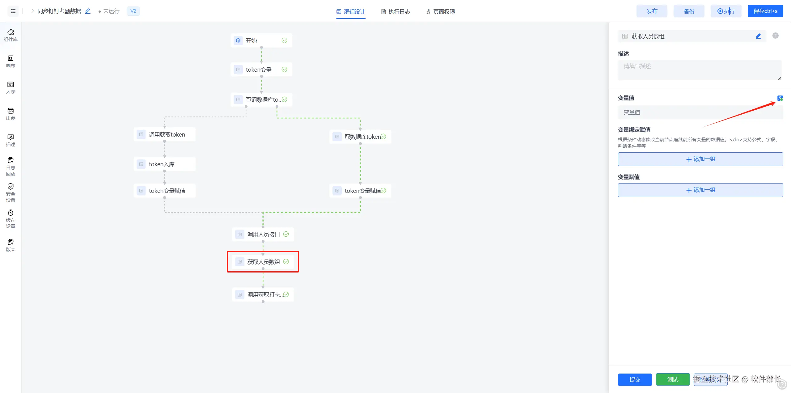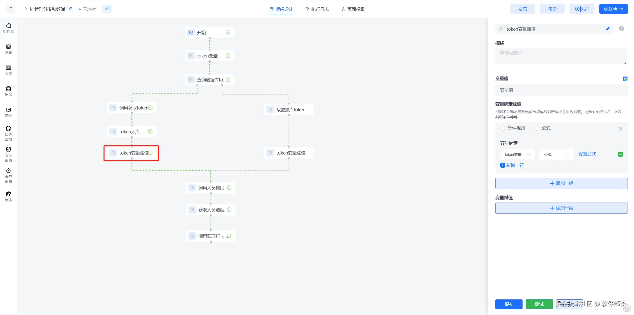 1.3 将拿到的token回填到【token变量】节点,【token变量赋值】节点(固定变量)可使用“变量绑定赋值”,对指定节点或字段进行赋值操作,后续调用钉钉接口时都使用【token变量】此变量数据。