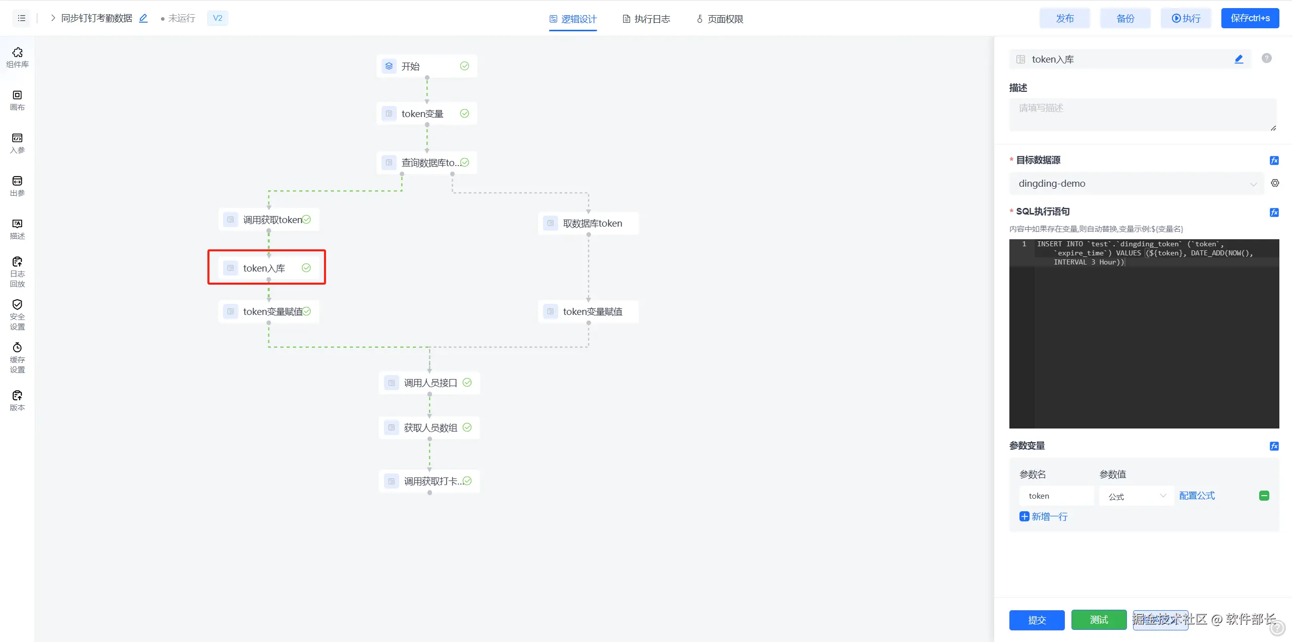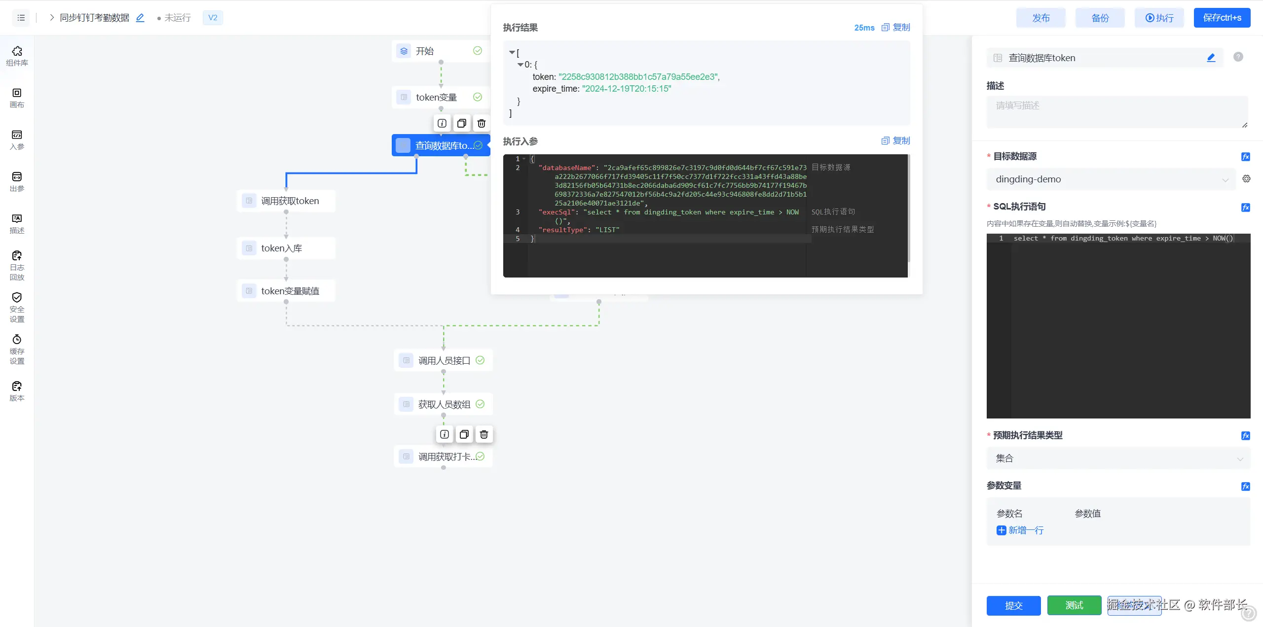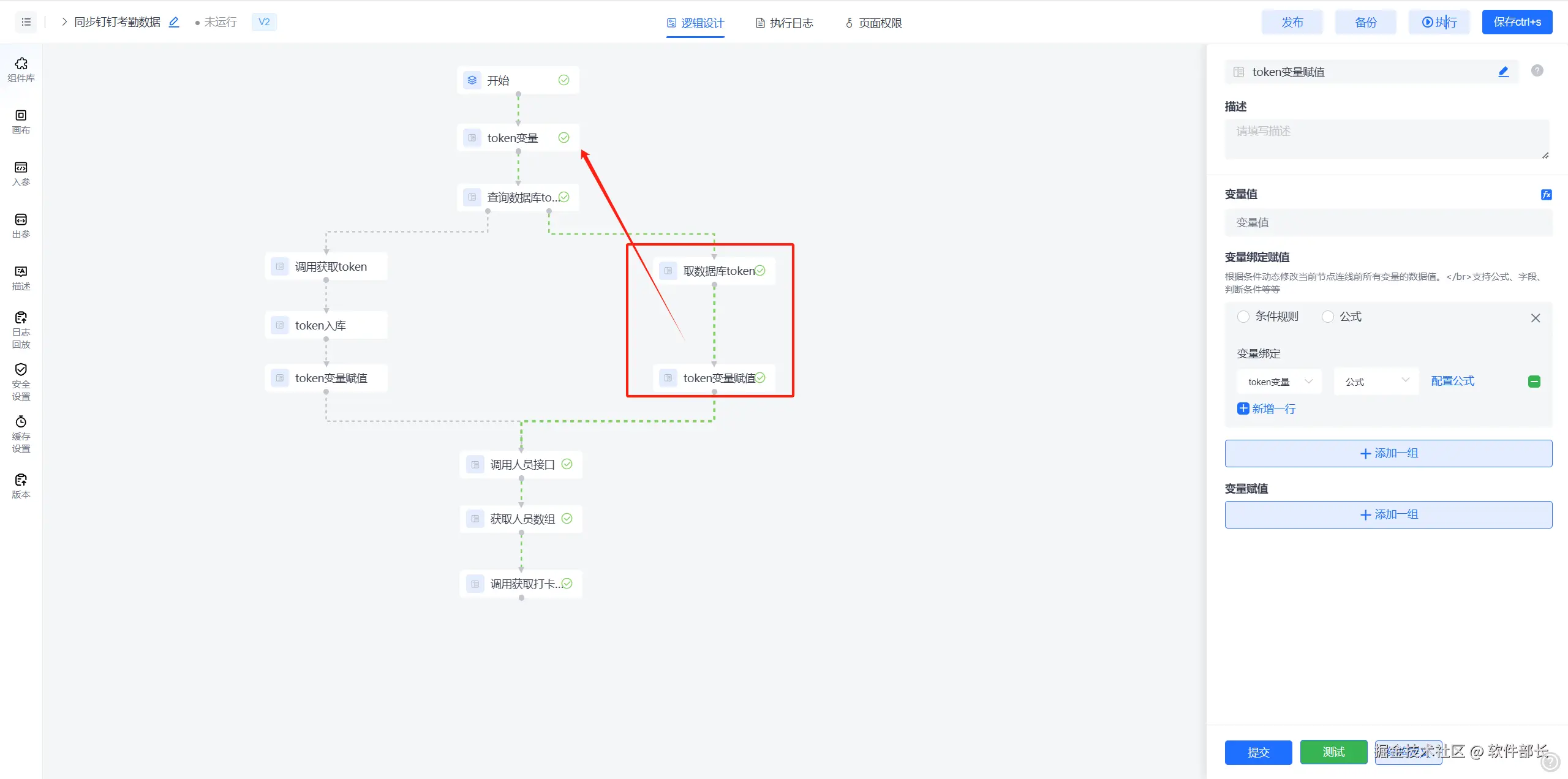 2、查询到数据库中存在有效token时,直接将token赋值给【token变量】节点。后续调用钉钉接口时都使用此变量数据。