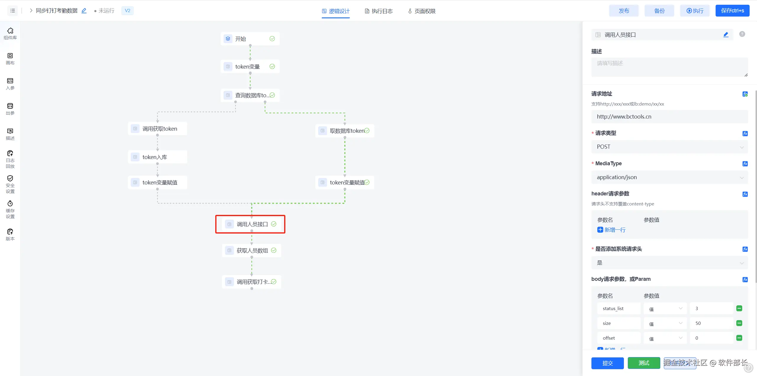**配置思路:**利用在逻辑引擎中可以调用外部接口,对接第三方系统的API的能力,以此拿到数据。主要使用的节点:【网络请求】,【固定变量】,MySQL操作节点。此处示例为对接钉钉接口,获取钉钉考勤打卡数据。