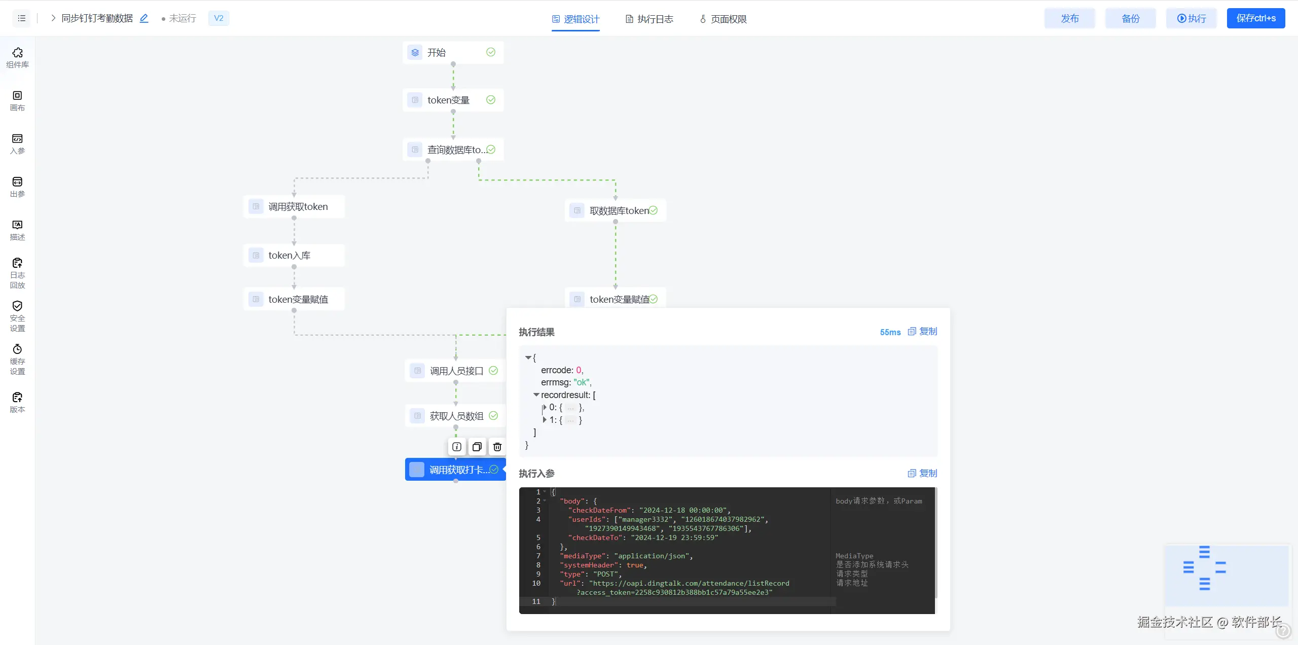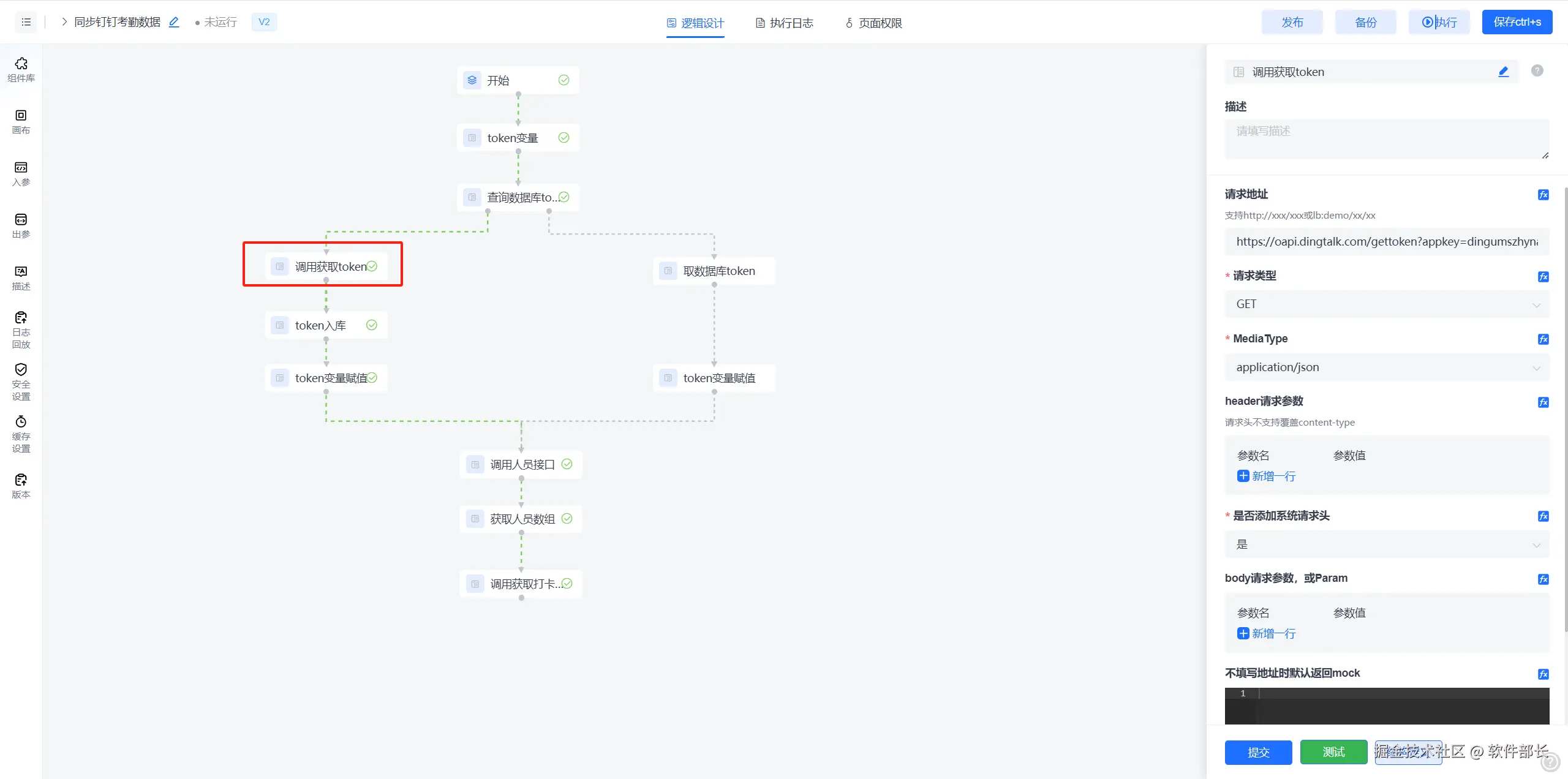 1.1 在分支执行线上面会根据(fx)执行结果(true/false)判断是否执行。此处判断【查询数据库token】是否有数据,没有查询到保存的token信息,或token信息已过期,则重新调用【获取token接口】open.dingtalk.com/document/or…