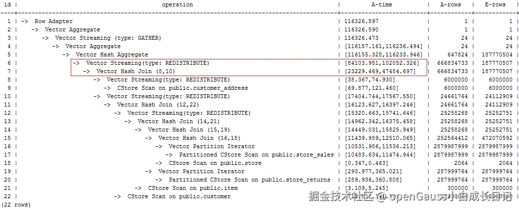 时间反而劣化了,原因是第8层hashjoin过慢引起第9层redistribute时间过慢导致,其中第9层redistribute并没有数据倾斜,hashjoin慢的原因是由于第18层redistribute后数据倾斜导致。
