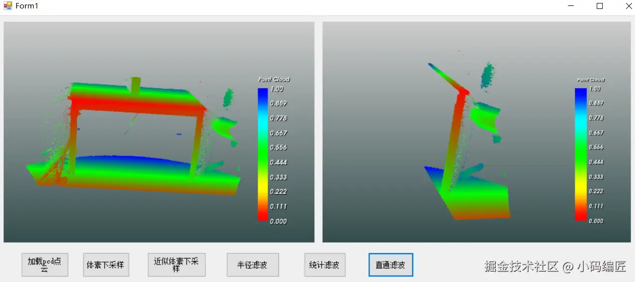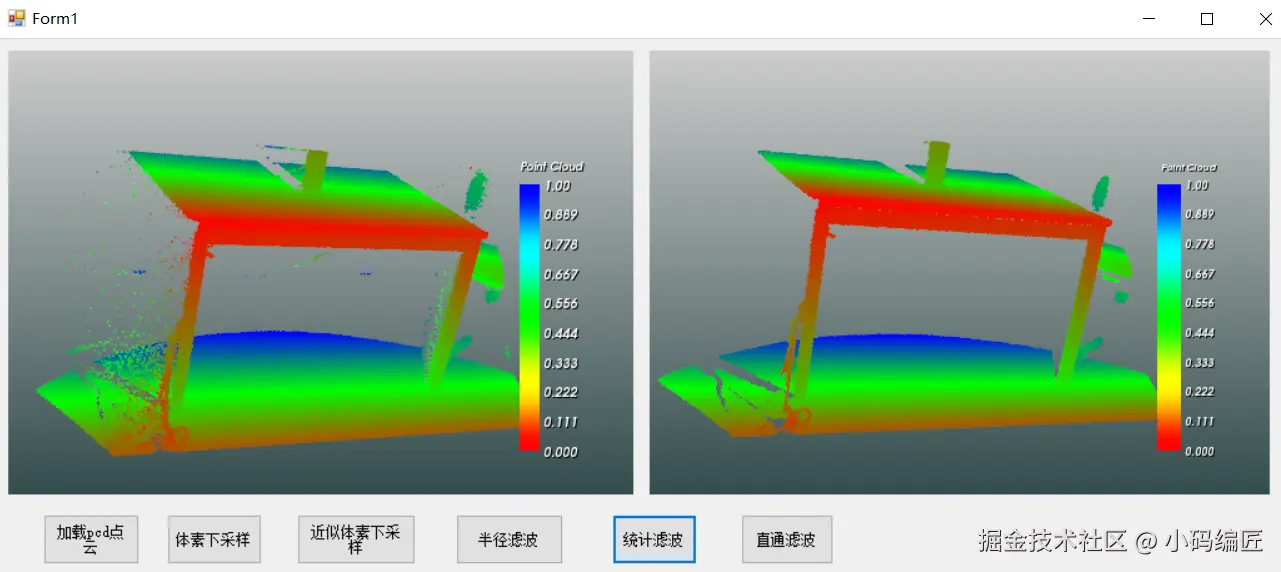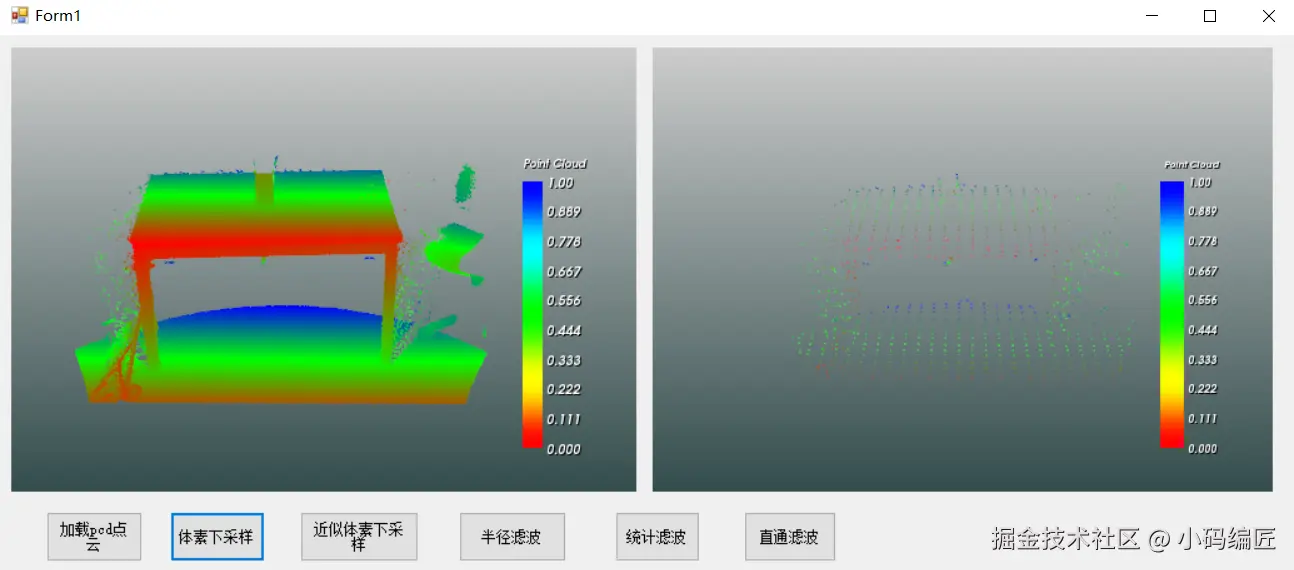 该demo主要是关于Filter模块的示例程序。在该demo中,笔者演示了如何对桌子文件(table_scene_lms400.pcd)进行体素下采样、均匀下采样、半径滤波、统计滤波、直通滤波等,并使用vtk进行可视化。