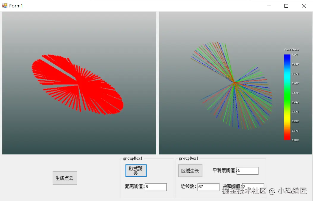 该demo主要是关于Segmentation模块的示例程序。在该demo中,笔者演示了如何使用VTK动态地生成圆形点云,并使用欧式聚类和区域生长对生成的点云进行分割。