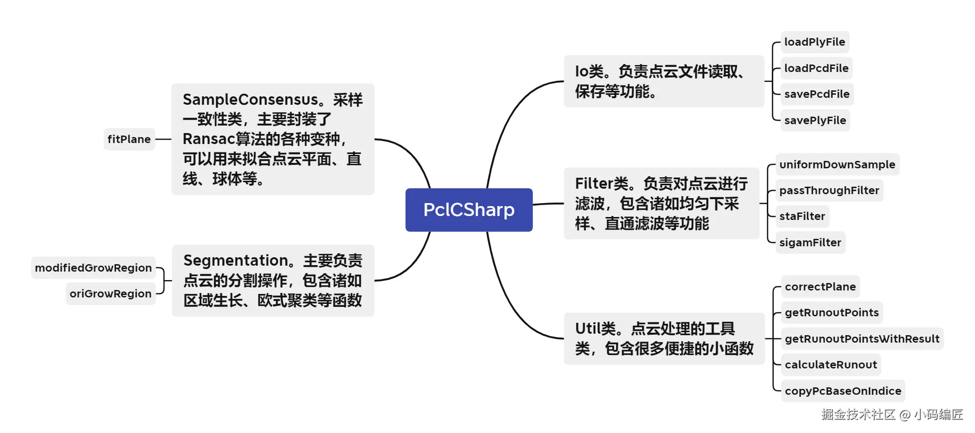 该命名空间中包含了pcl中点云处理的算法,暂时封装了Io、Filter、Segmentation、SampleConsensus和Util五个静态类,每个类大体对应着pcl的一个模块,后续会慢慢增加其他模块。各个类之间的关系见下图。