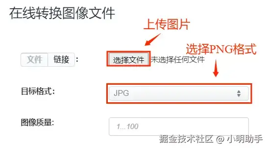第三步: 点击【选择文件】按钮上传图片,然后选择PNG为目标格式。