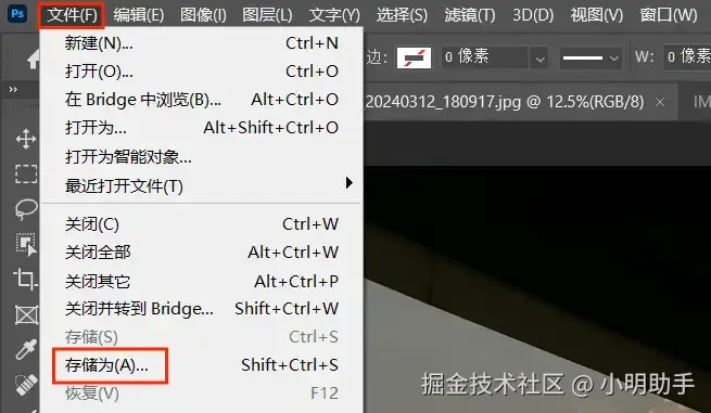 第二步: 导入图片后,点击左上角的【文件】按钮,选择下拉列表中的【存储为】选项。