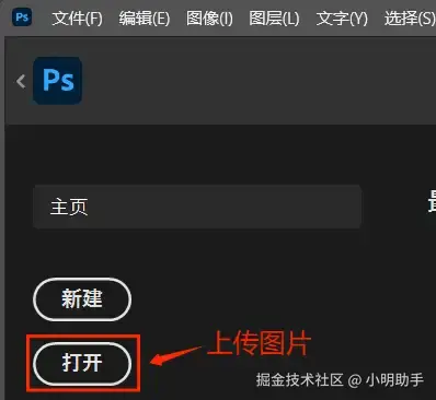 第一步: 打开PS软件,点击首页的【打开】按钮,导入需要进行转换的图片。