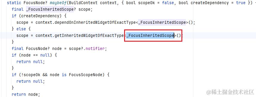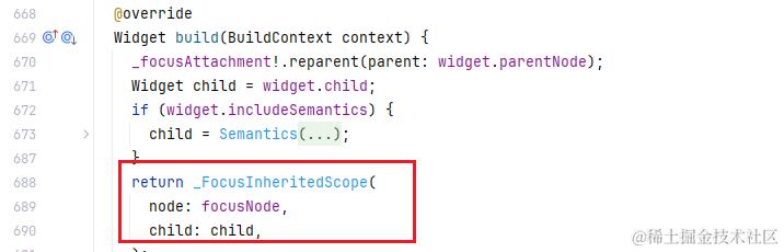 在最最重要的 build 方法中,构建逻辑非常简单,就是将 focusNode 传递给 _FocusInheritedScope。源码中看到 XXXScope 就应该下意识地知道它是一个 InheritedWidget, 向子树传递数据: