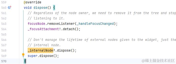 另外 State#dispose 方法中如果 _internalNode 非空会被销毁。但如果是外界传入的 FocusNode,则不会在这里主动销毁。需要使用者自行维护节点对象的生命周期。