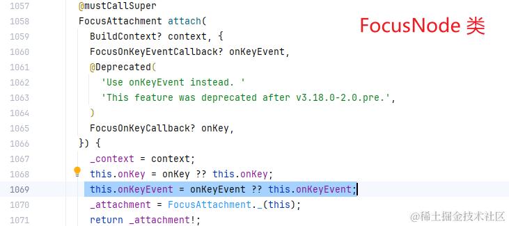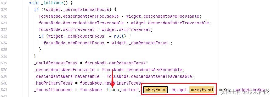 Focus 组件最重要的是监听键盘事件,那 onKeyEvent 是在哪里触发的呢? 在 _initNode 初始化焦点节点时,Focus 组件传入的 onKeyEvent 被传入 FocusNode#attach 方法中: